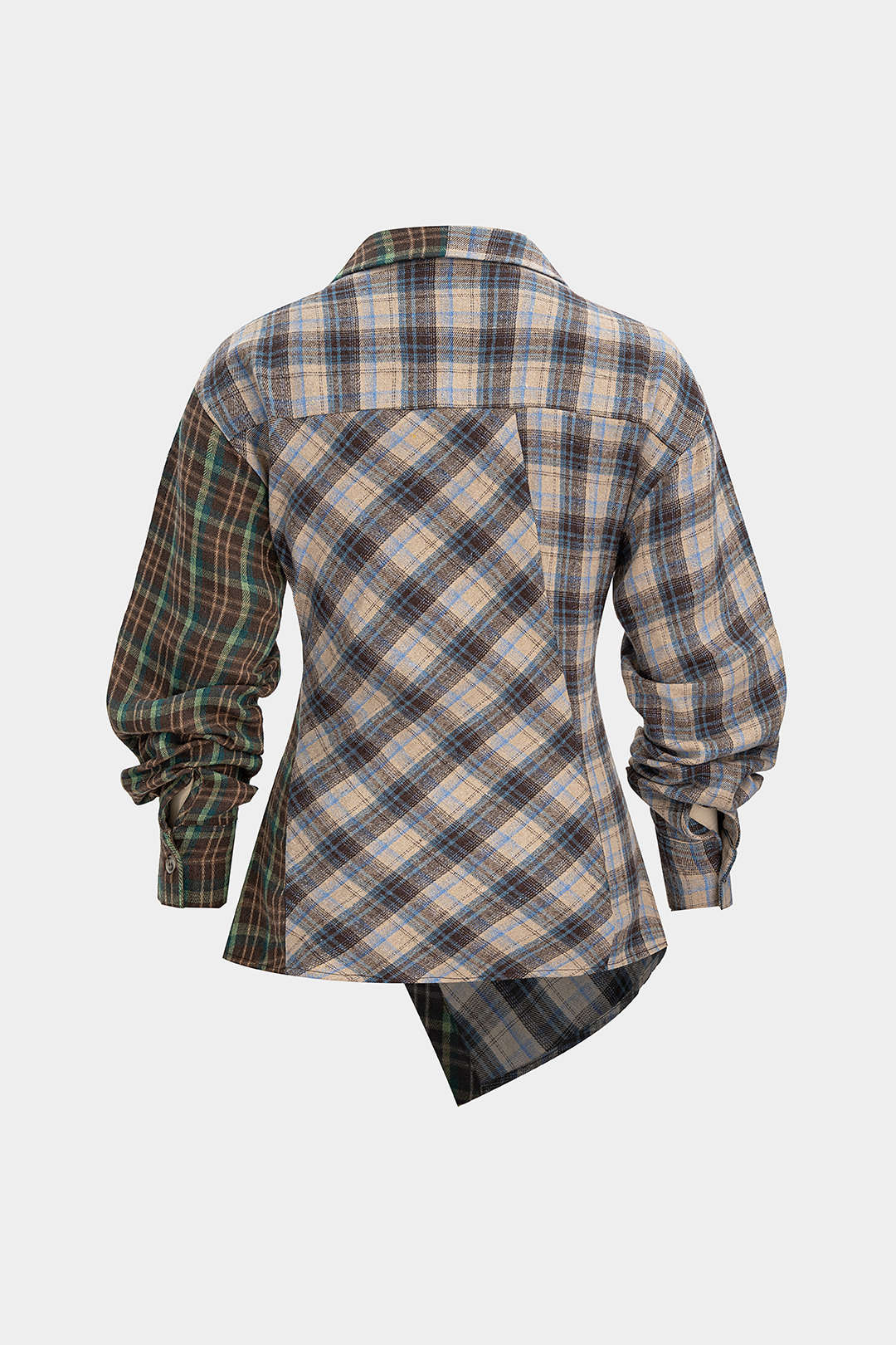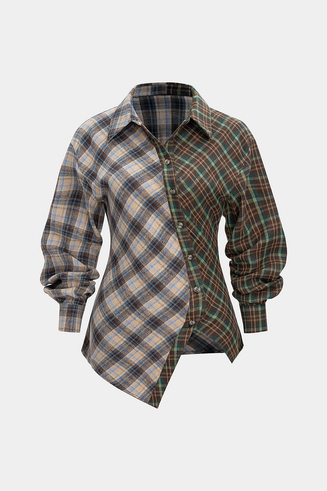 Plaid Print Asymmetrical Button Long-Sleeve Shirt