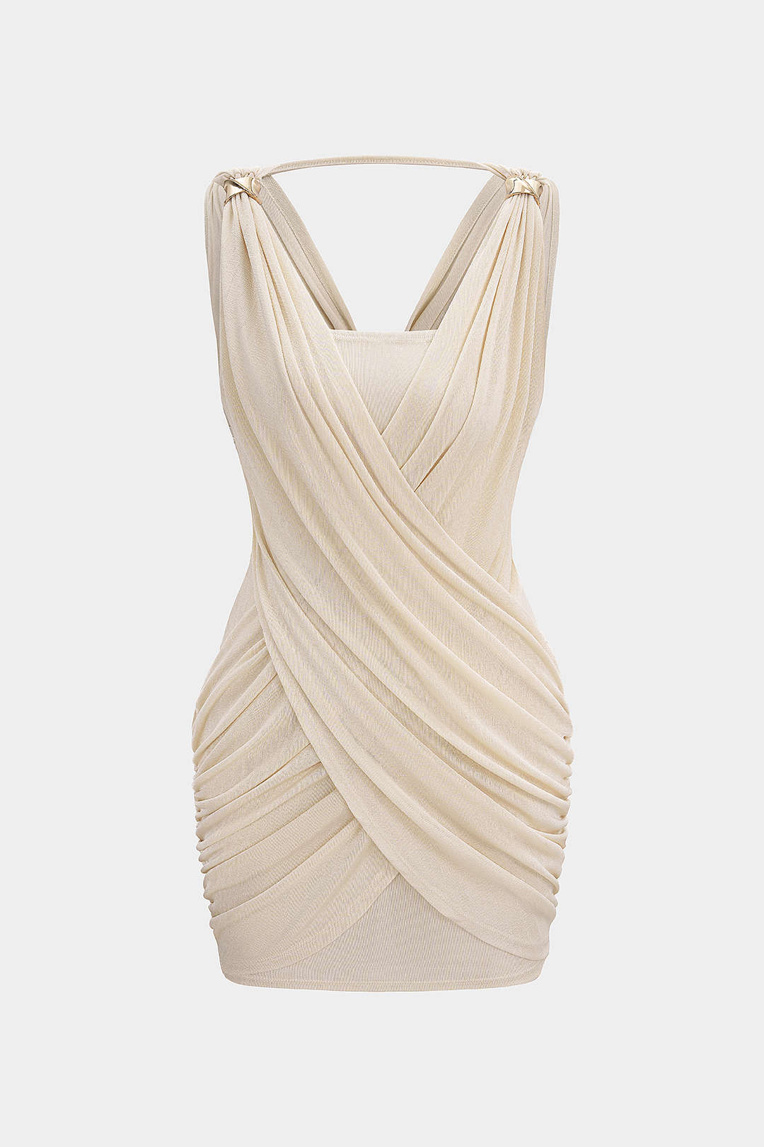 Crossed V-Neck Ruched Metallic Decor Sleeveless Mini Dress