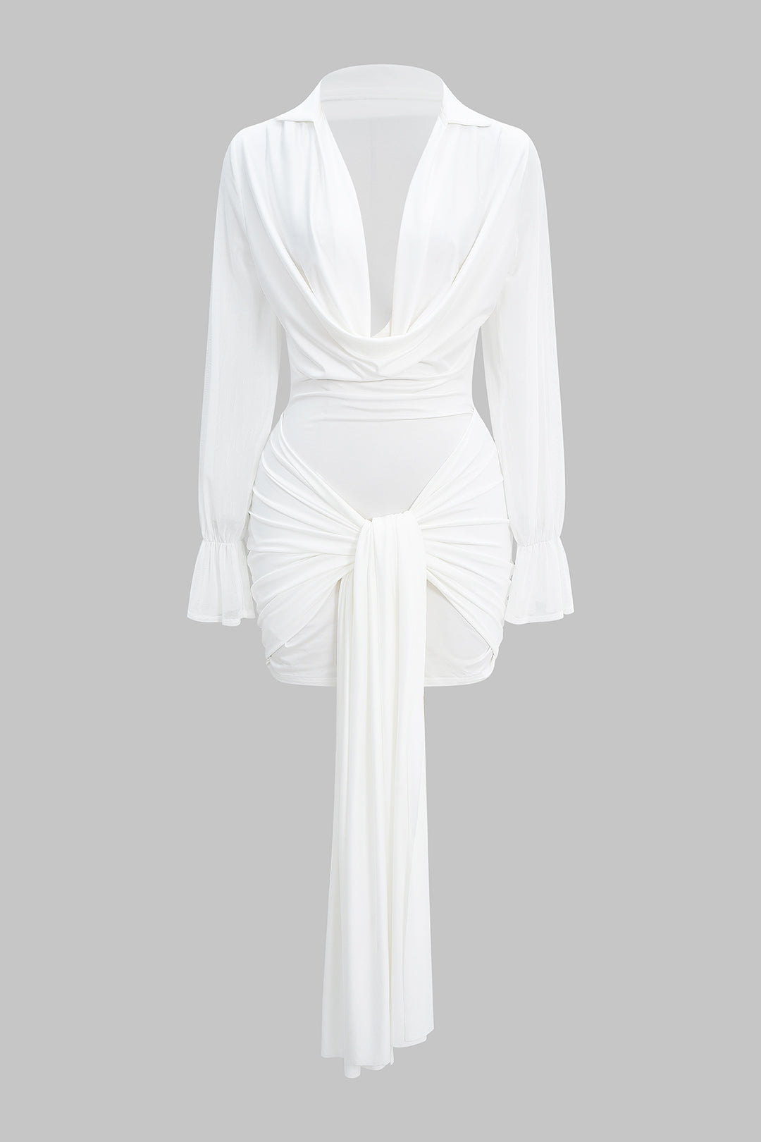 Draped Cowl Neck Knotted Long Sleeve Mini Dress