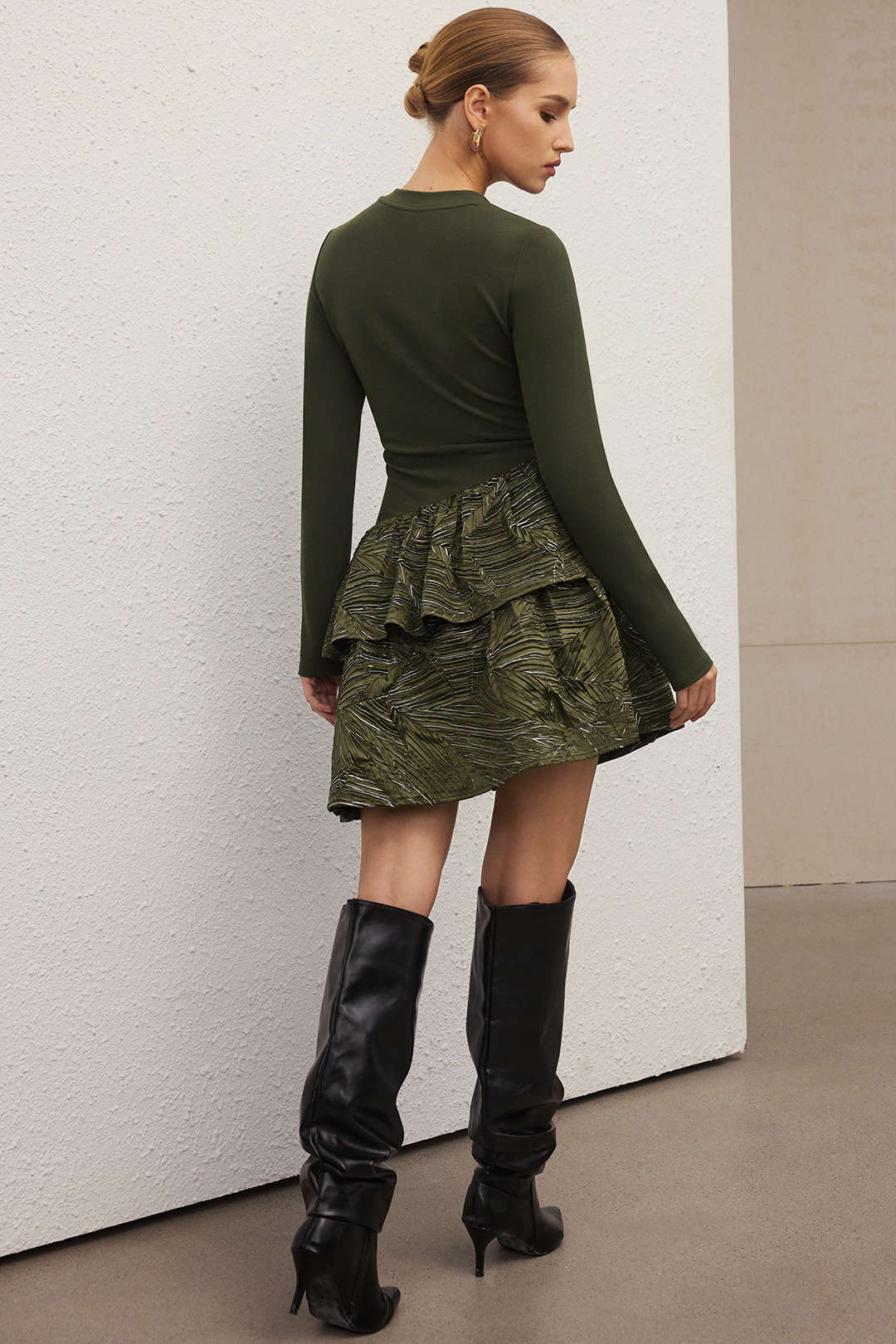 Patchwork Jacquard Ruched Asymmetrical Long Sleeve Mini Dress