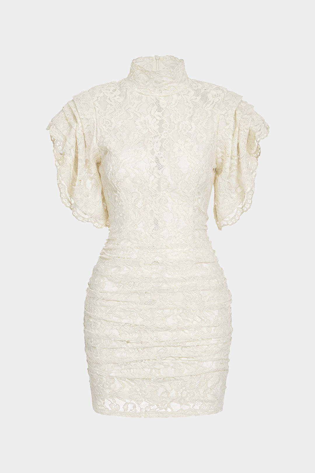 Sheer Lace Mock Neck Ruched Short Sleeve Mini Dress