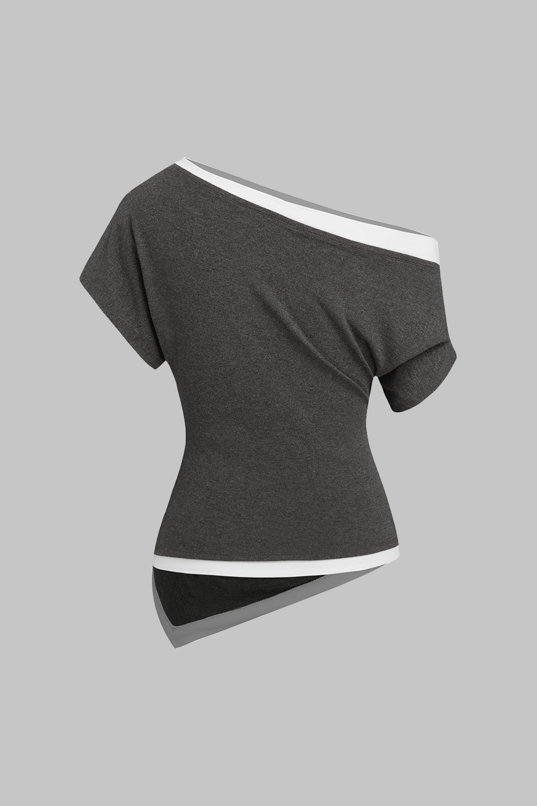 One Shoulder Contrast Ruched Short Sleeve T-Shirt