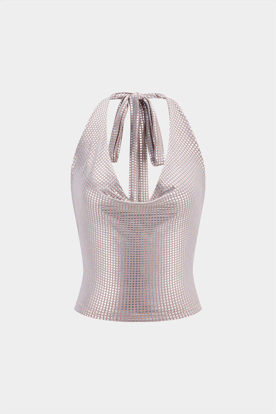Geometric Print Halter Draped Cowl Neck Tie-Up Backless Cami Top