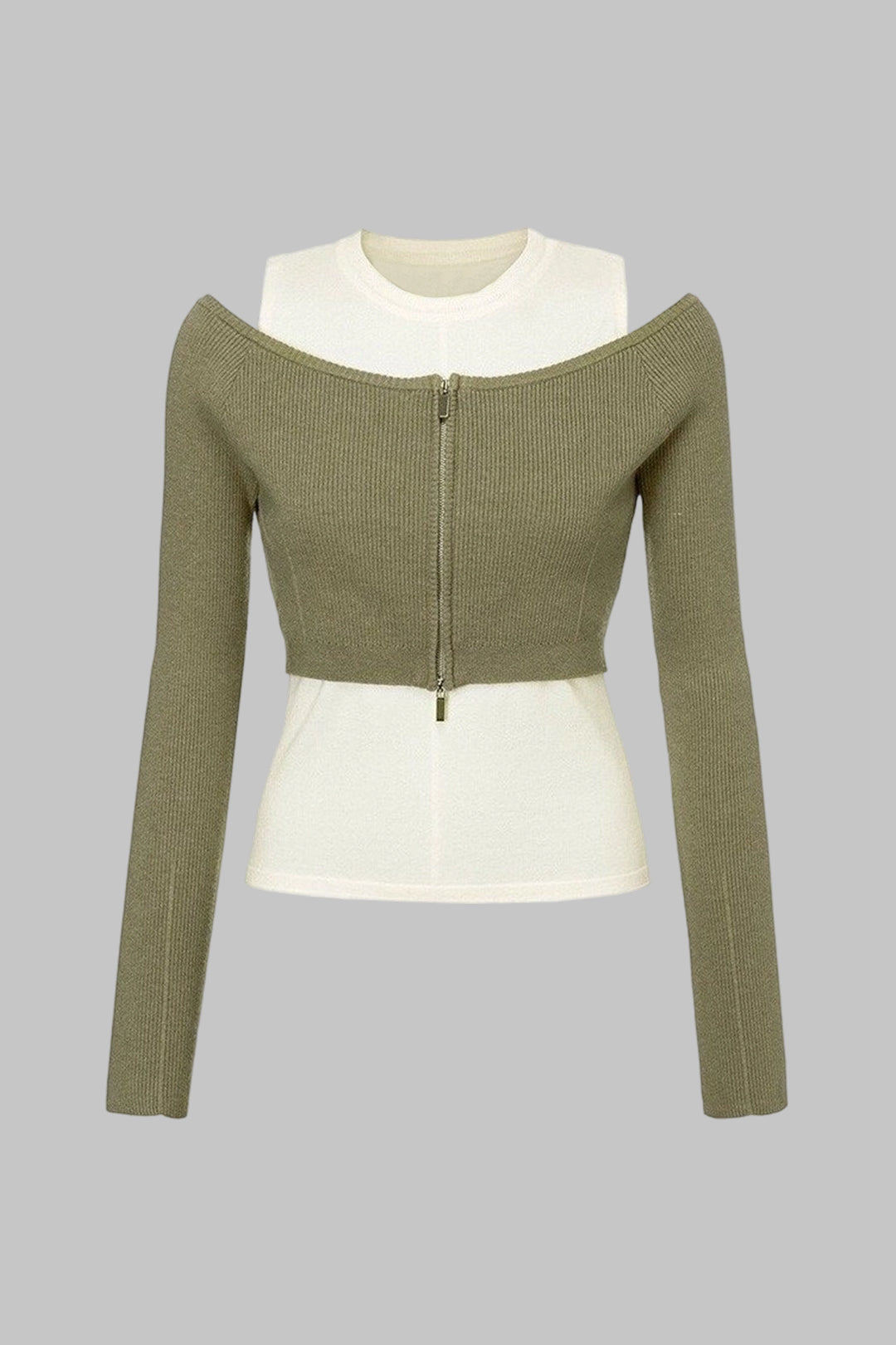 Contrast Zipper Hollow Out Long-Sleeve Top