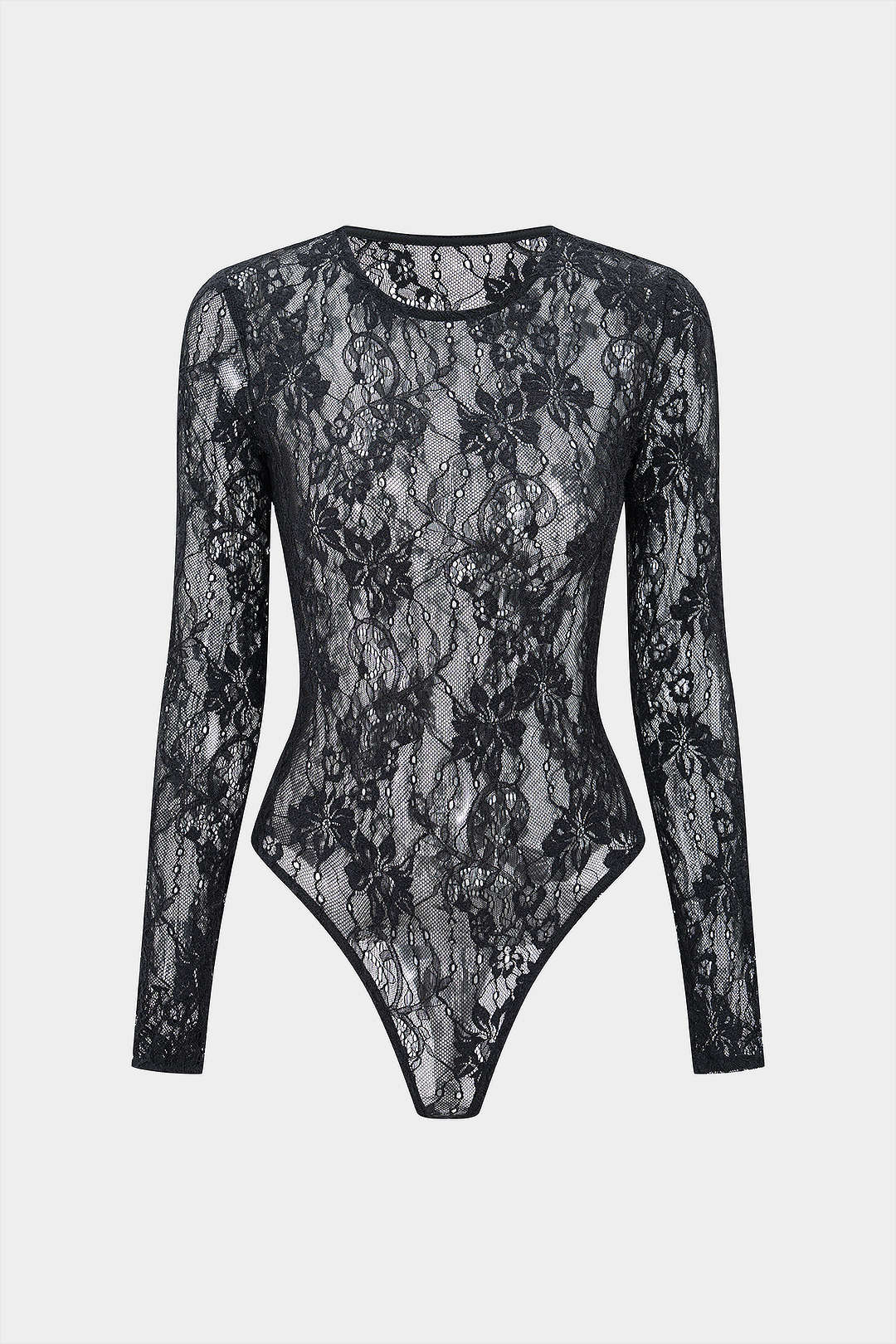 Floral Embroidery Lace Round Neck Long Sleeve Bodysuit