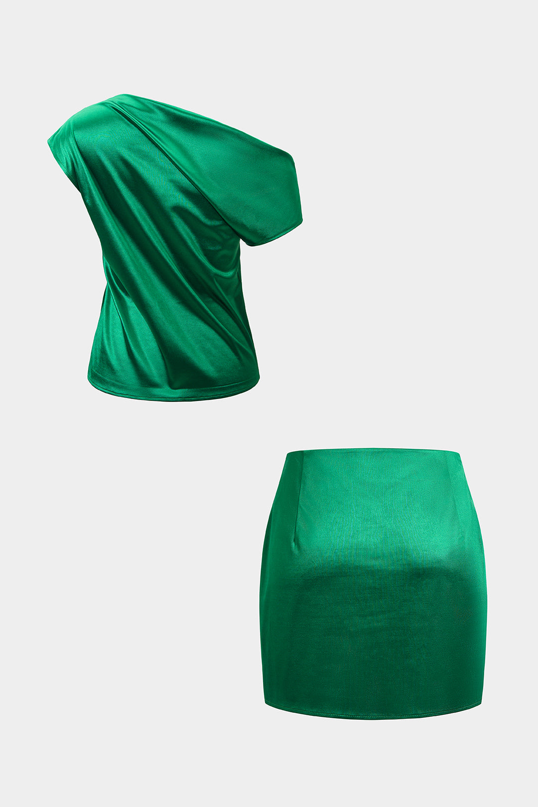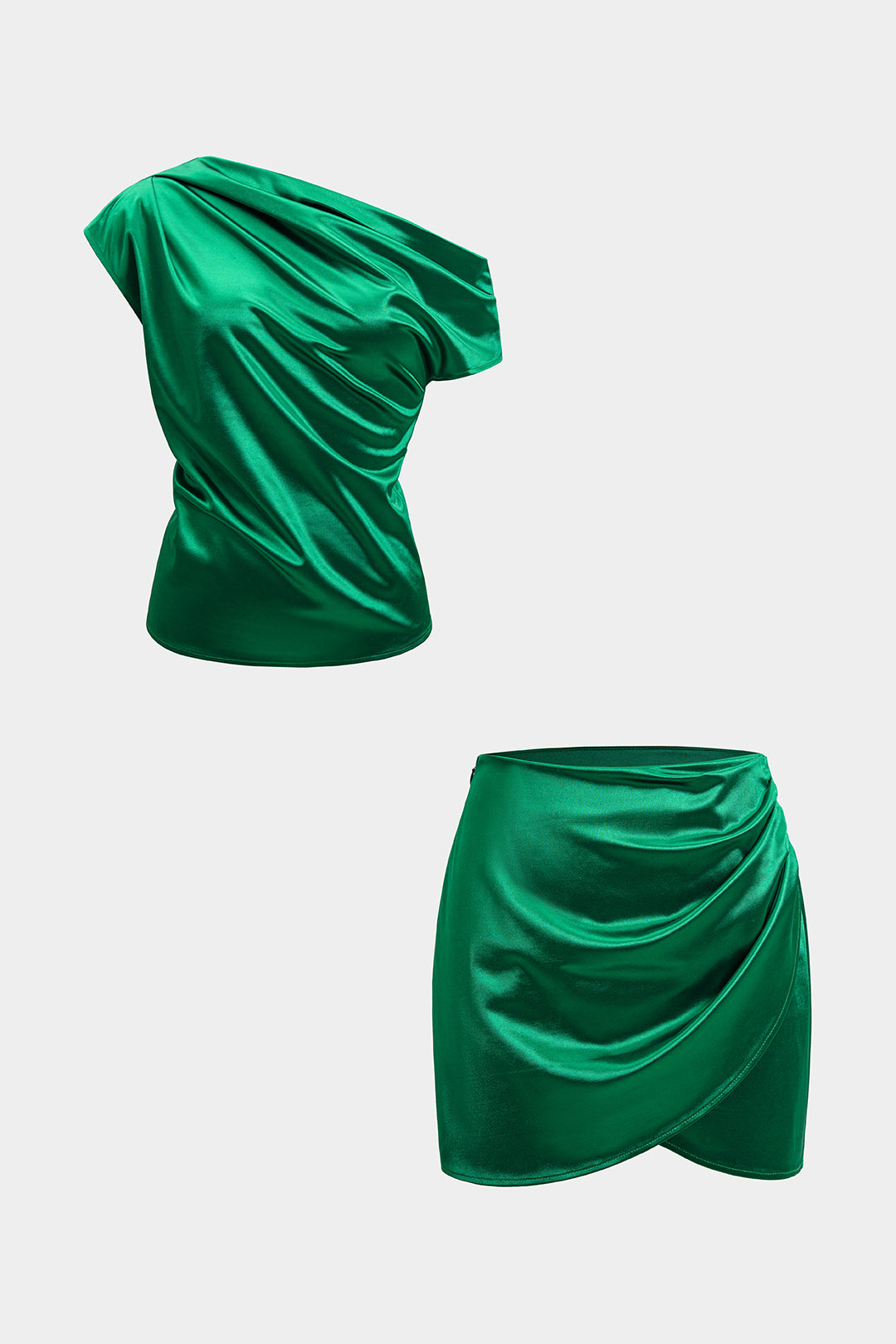 Satin One Shoulder Ruched Top And Asymmetrical Skirt Set