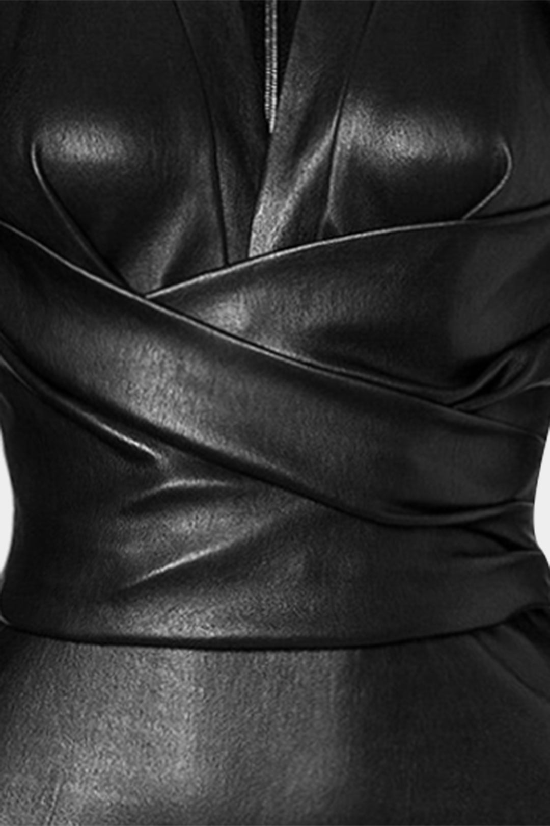 Faux Leather Crossed Ruched Long Sleeve Mini Dress