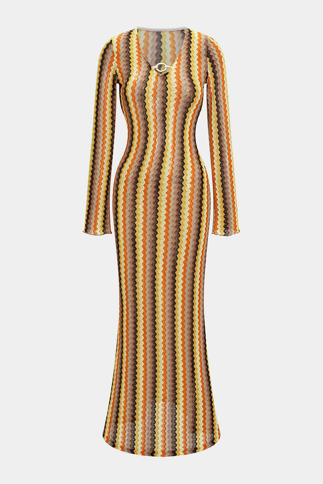 Contrast Woven V-Neck Long Sleeve Midi Dress