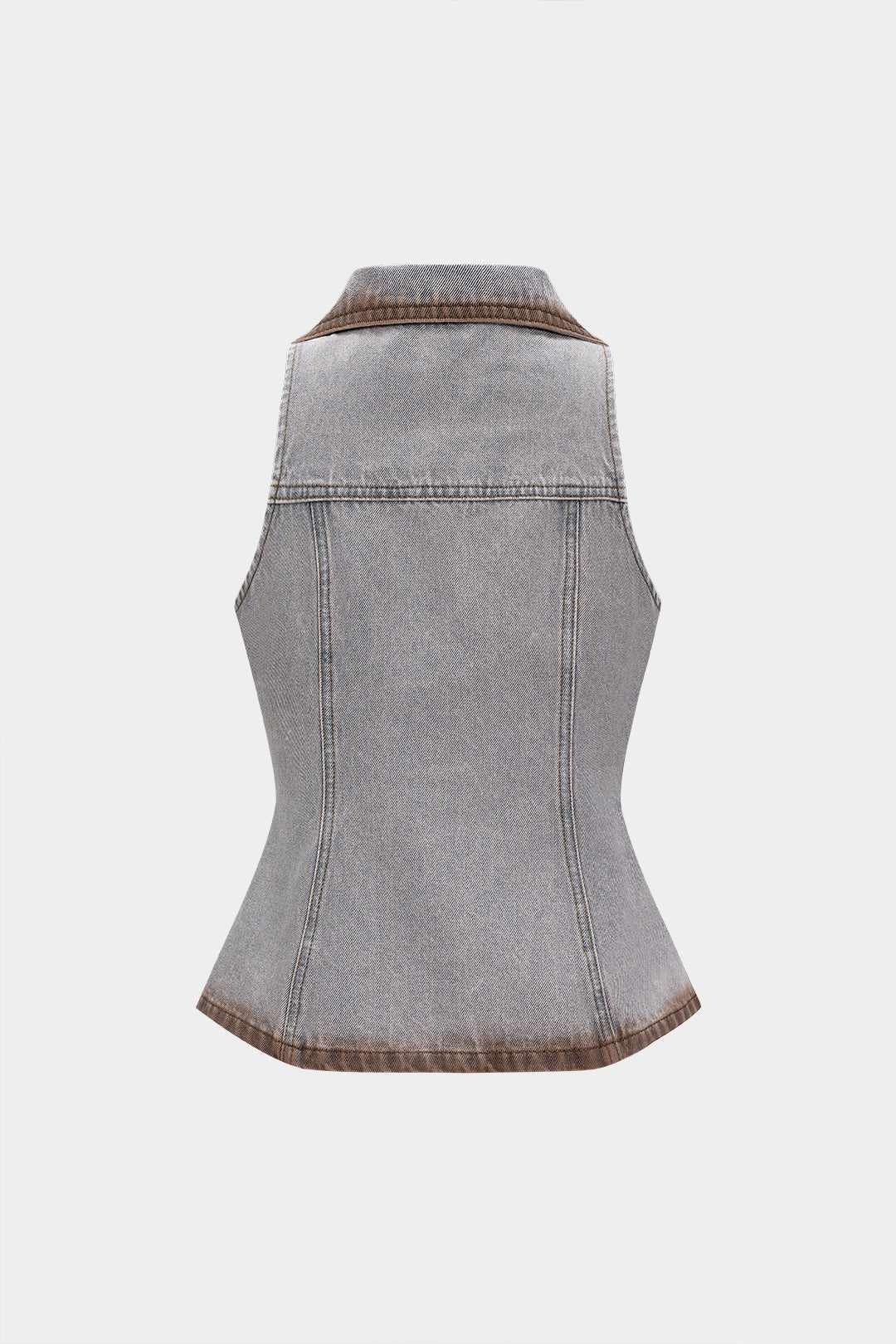 Denim Contrast Binding Button Washed V-Neck Crop Top