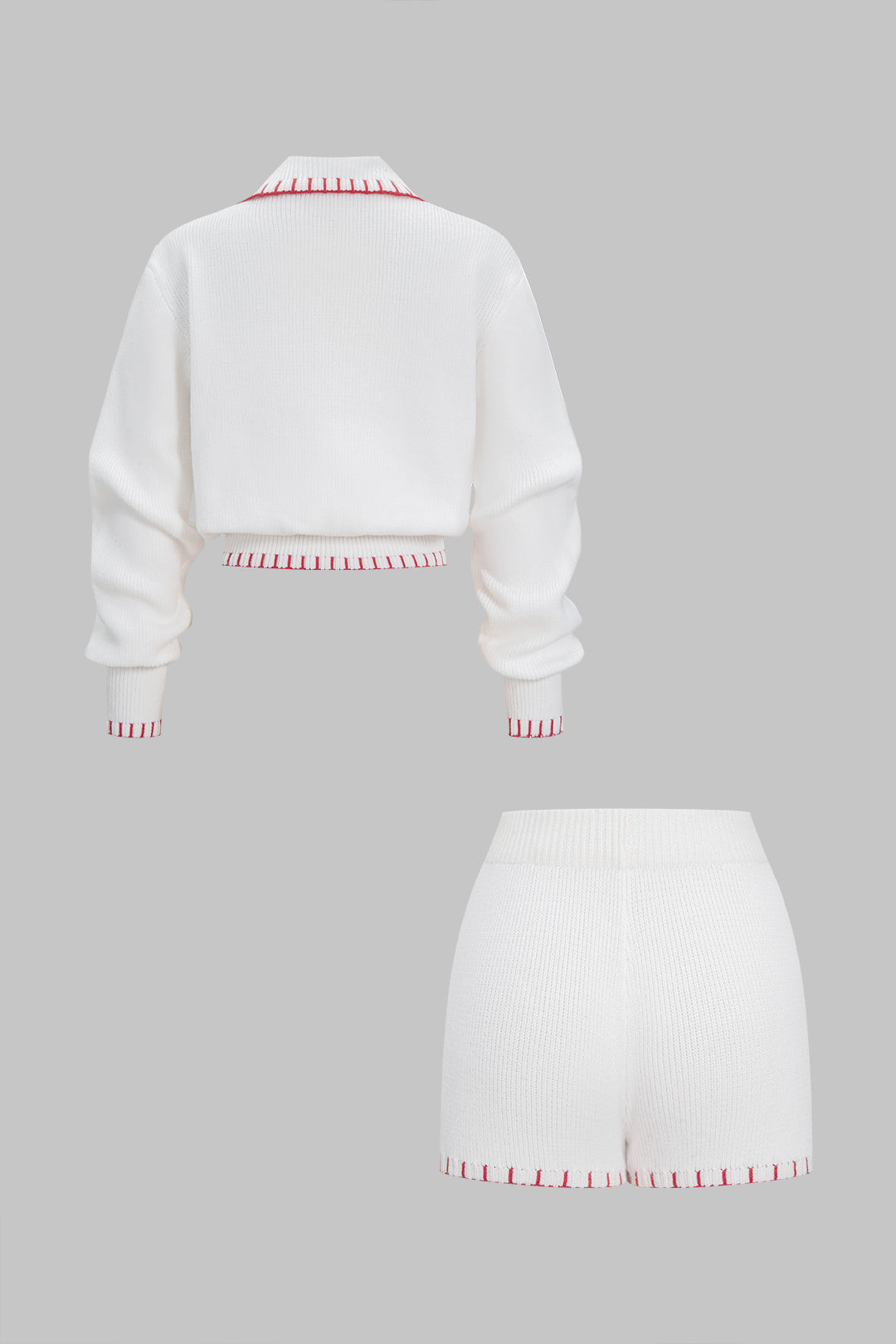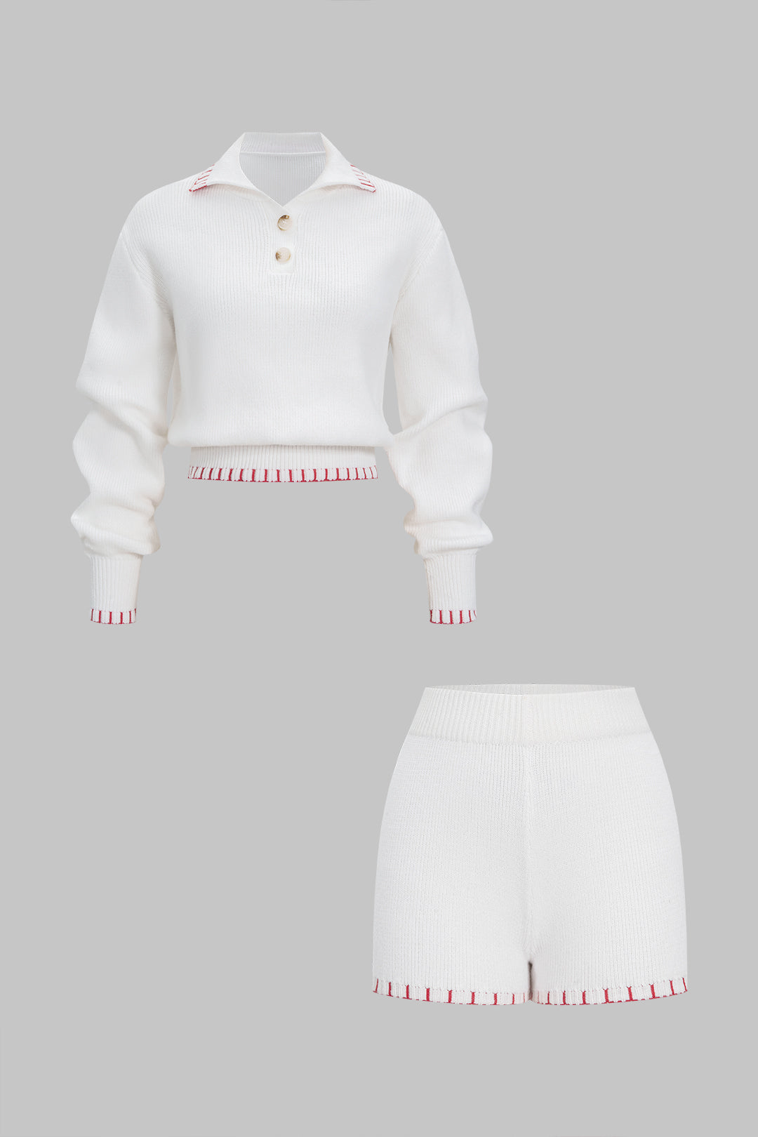 Knit Contrast Button Ribbed Long-Sleeve Top And Shorts Set