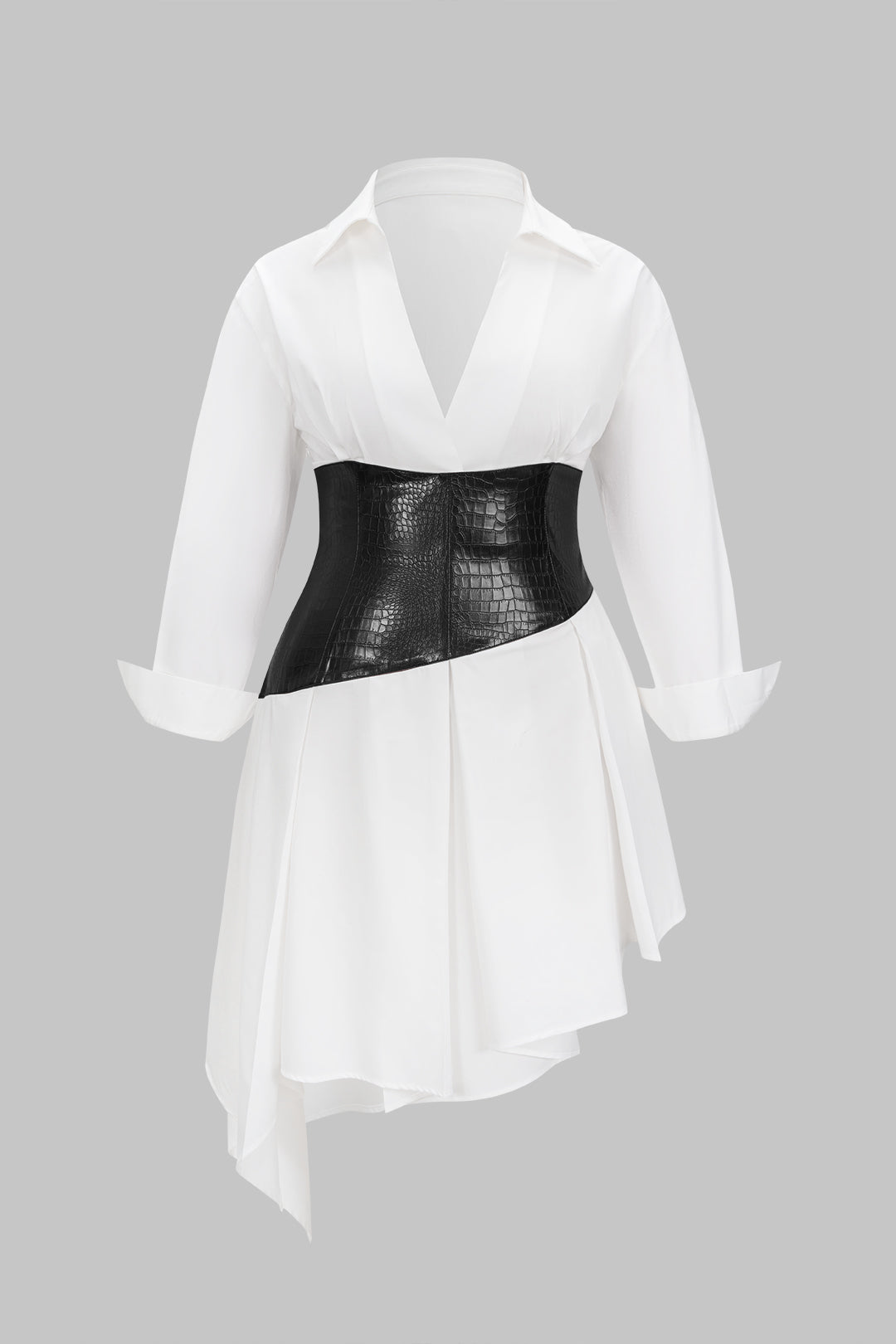 Plus Size Faux Leather Patchwork V-Neck Irregular Hem Long Sleeve Midi Dress