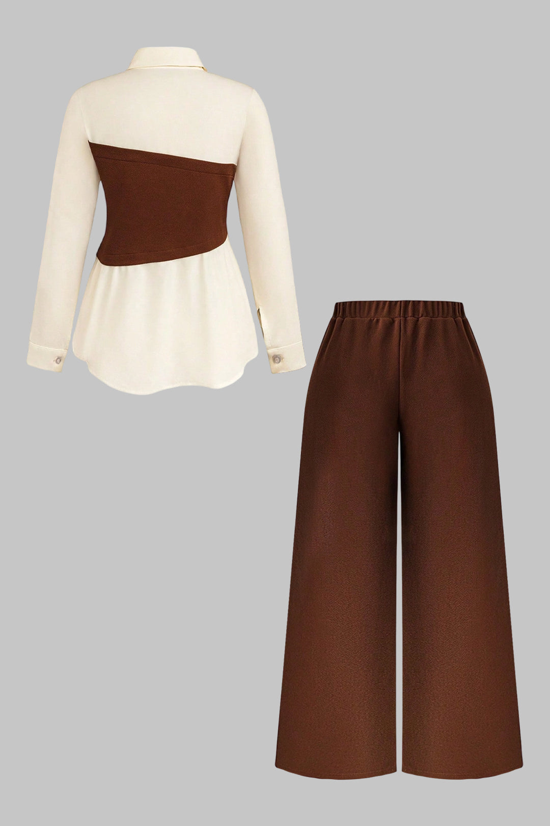 Plus Size Contrast Long Sleeve Shirt And Wide Leg Pants Set
