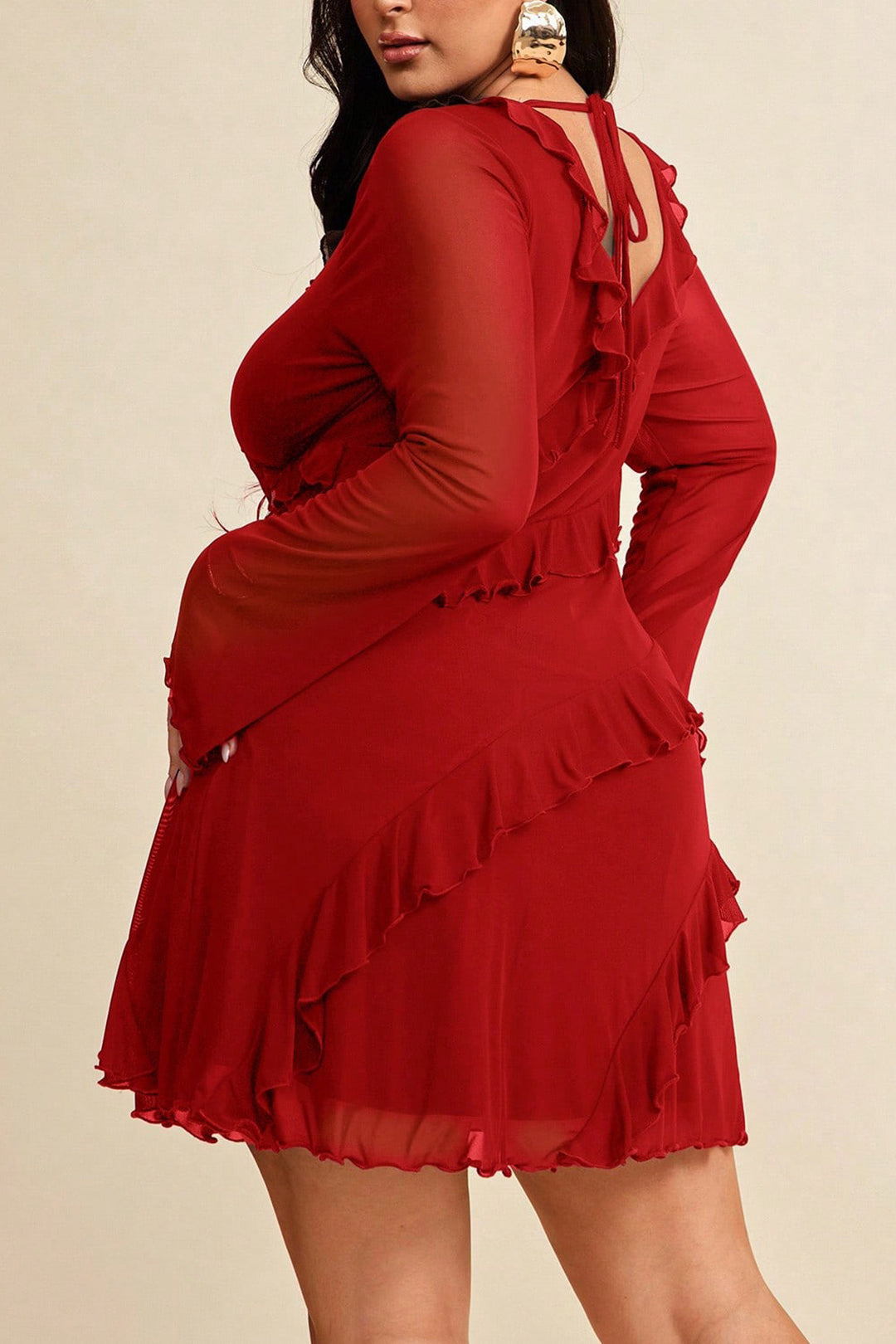 Plus Size Mesh Ruffle V-Neck Long Sleeve Mini Dress