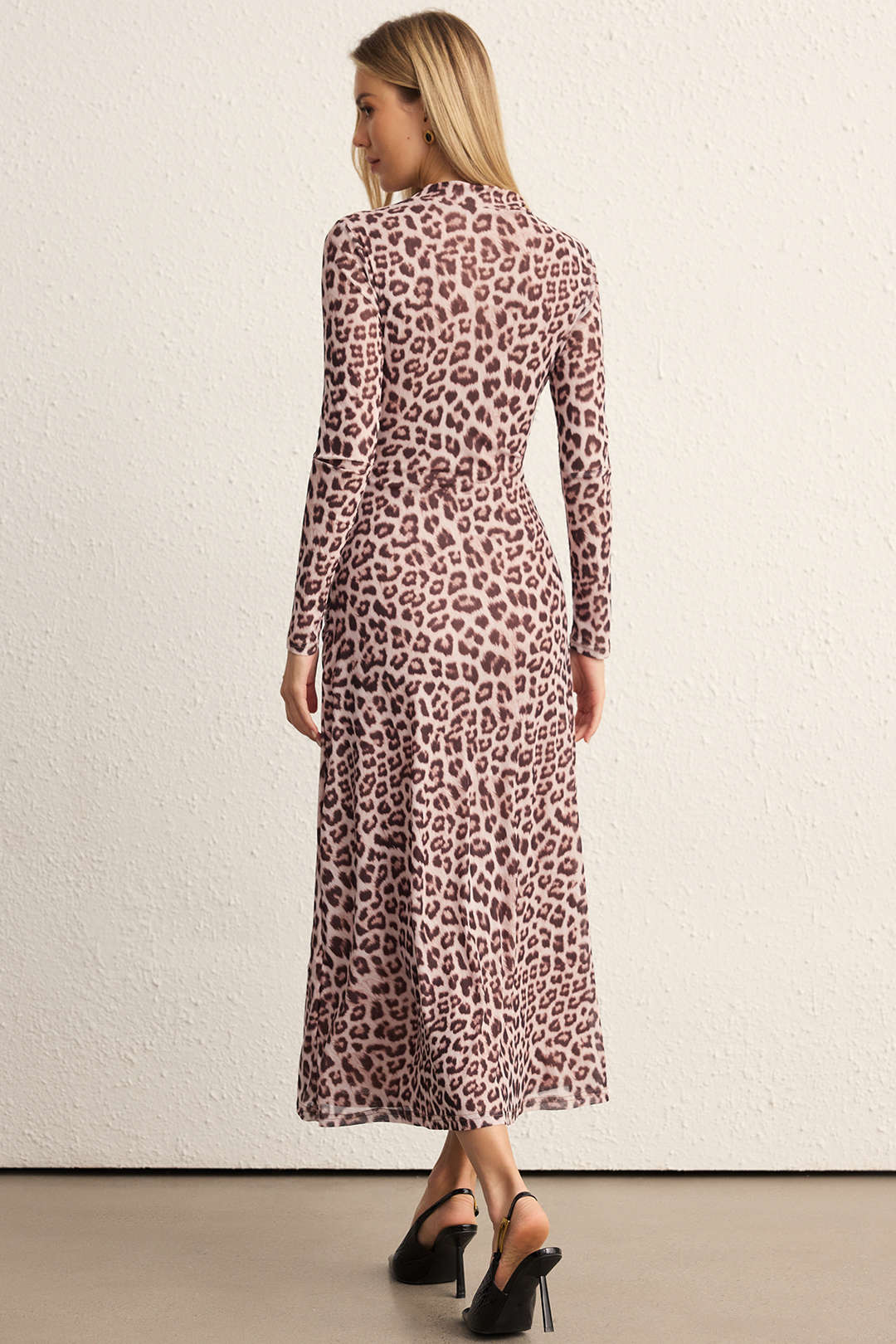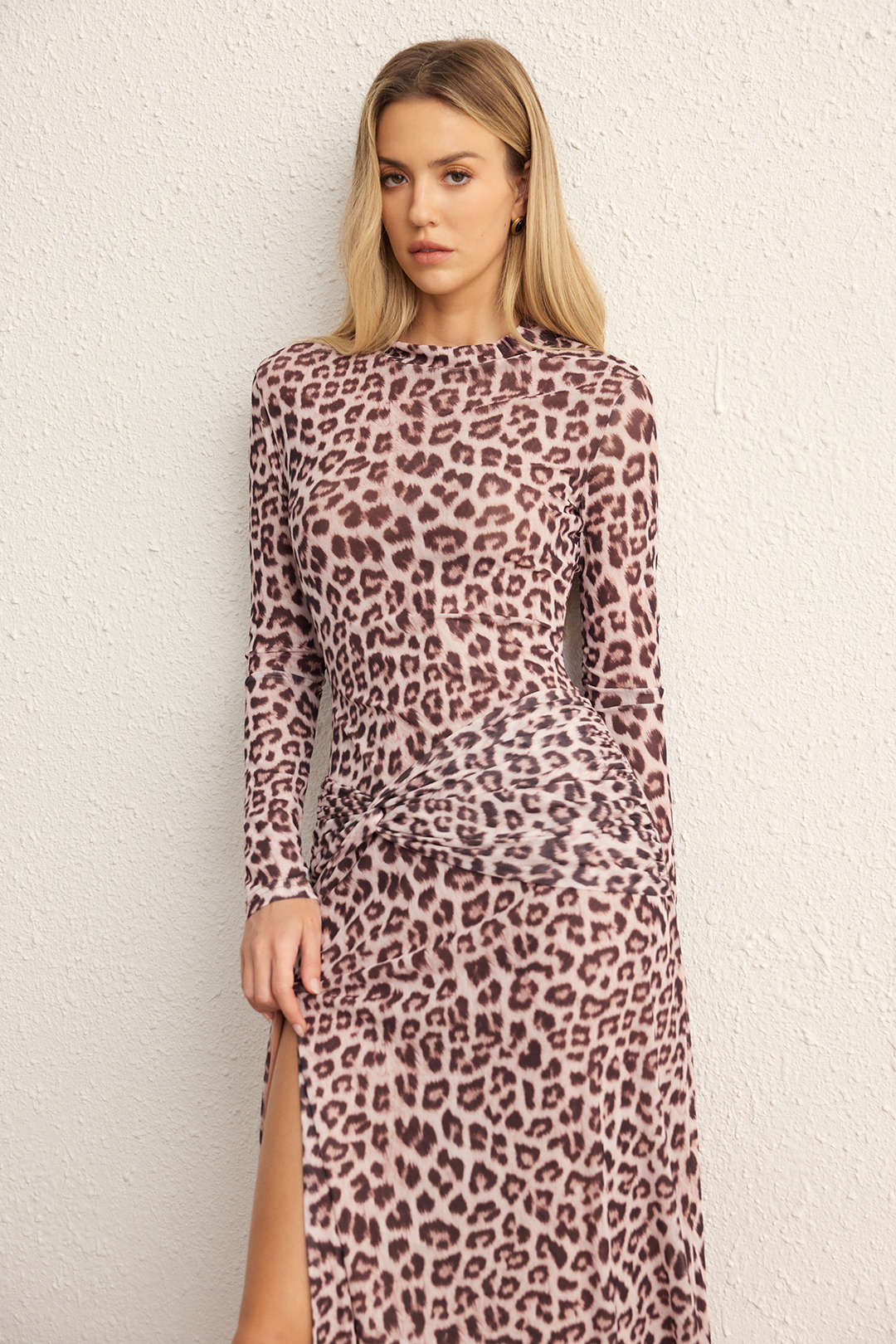 Leopard Print Mesh Ruched Slit Long Sleeve Midi Dress