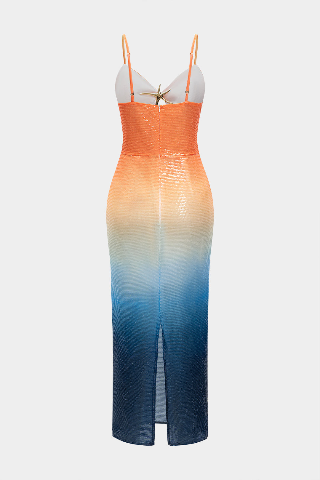 Ombre Print Sequin Metallic Decor Slit Slip Sleeveless Midi Dress