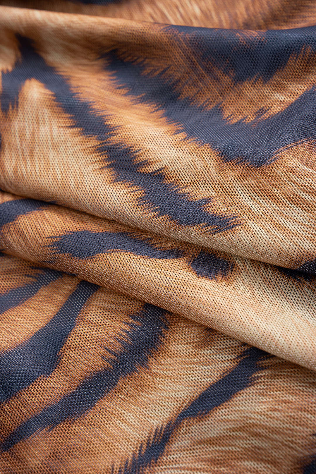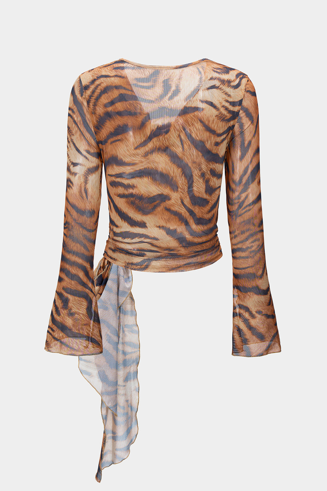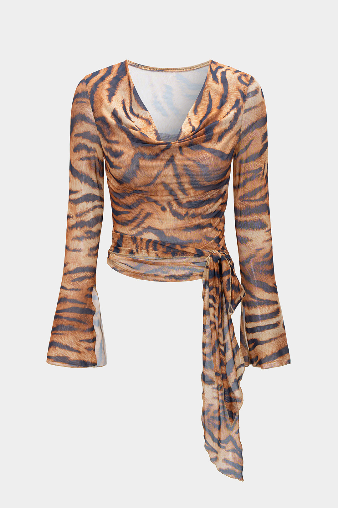 Leopard Print Draped Cowl Neck Tie Front Long-Sleeve Top