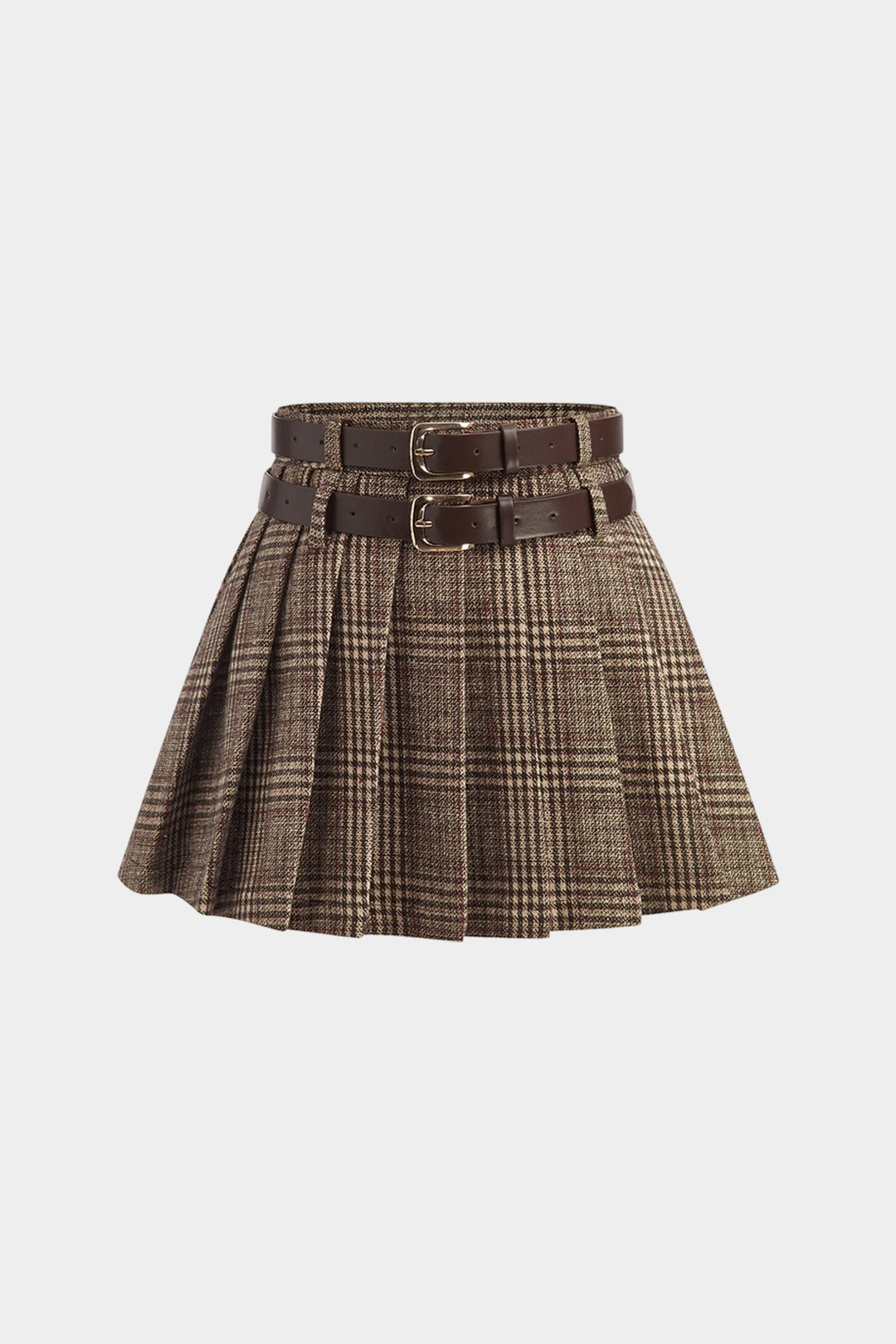 Plaid Print Woolen Belted Pleated Skirt