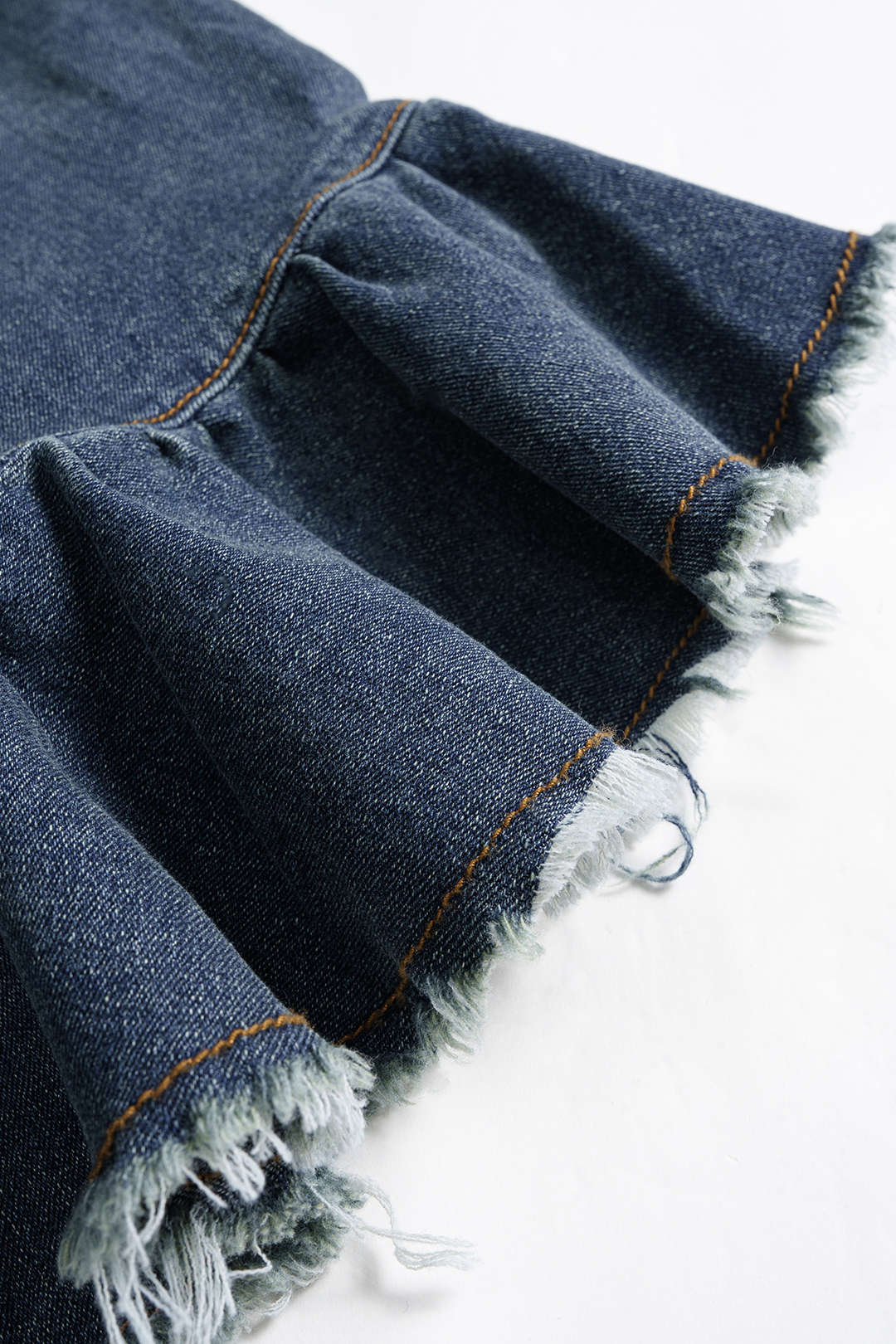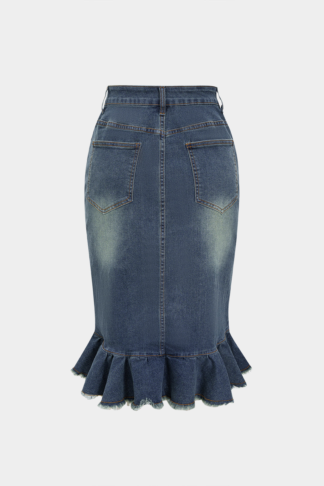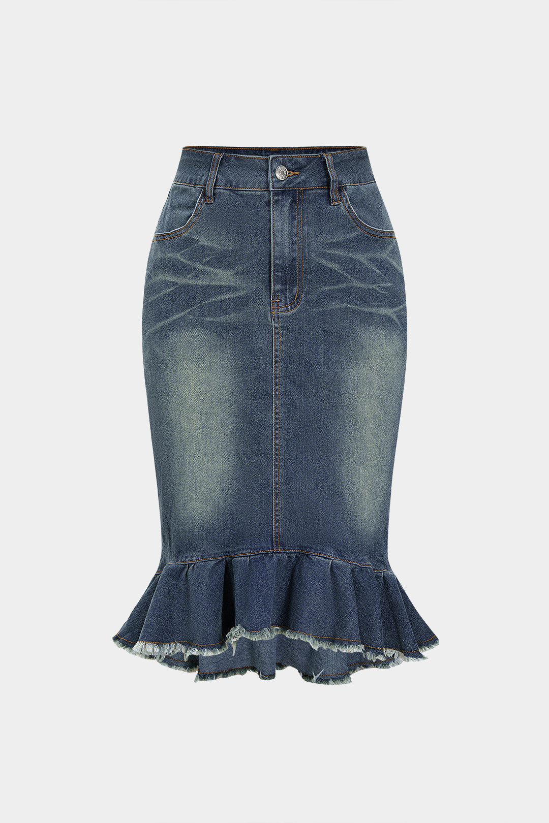 Denim Ruffle Frayed Mermaid High Waist Skirt