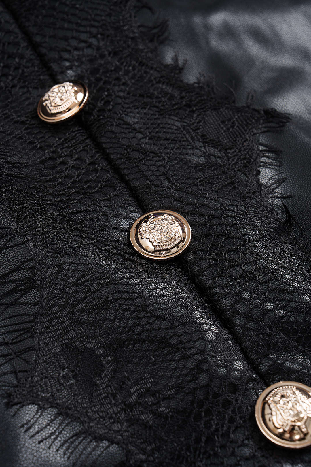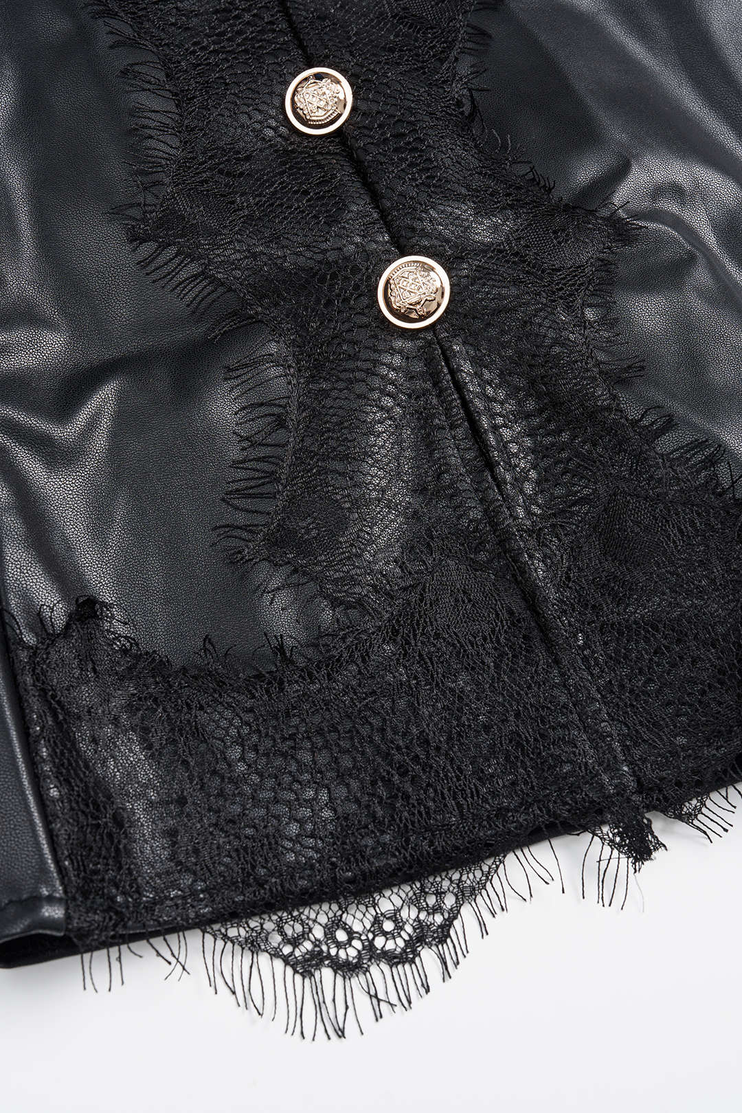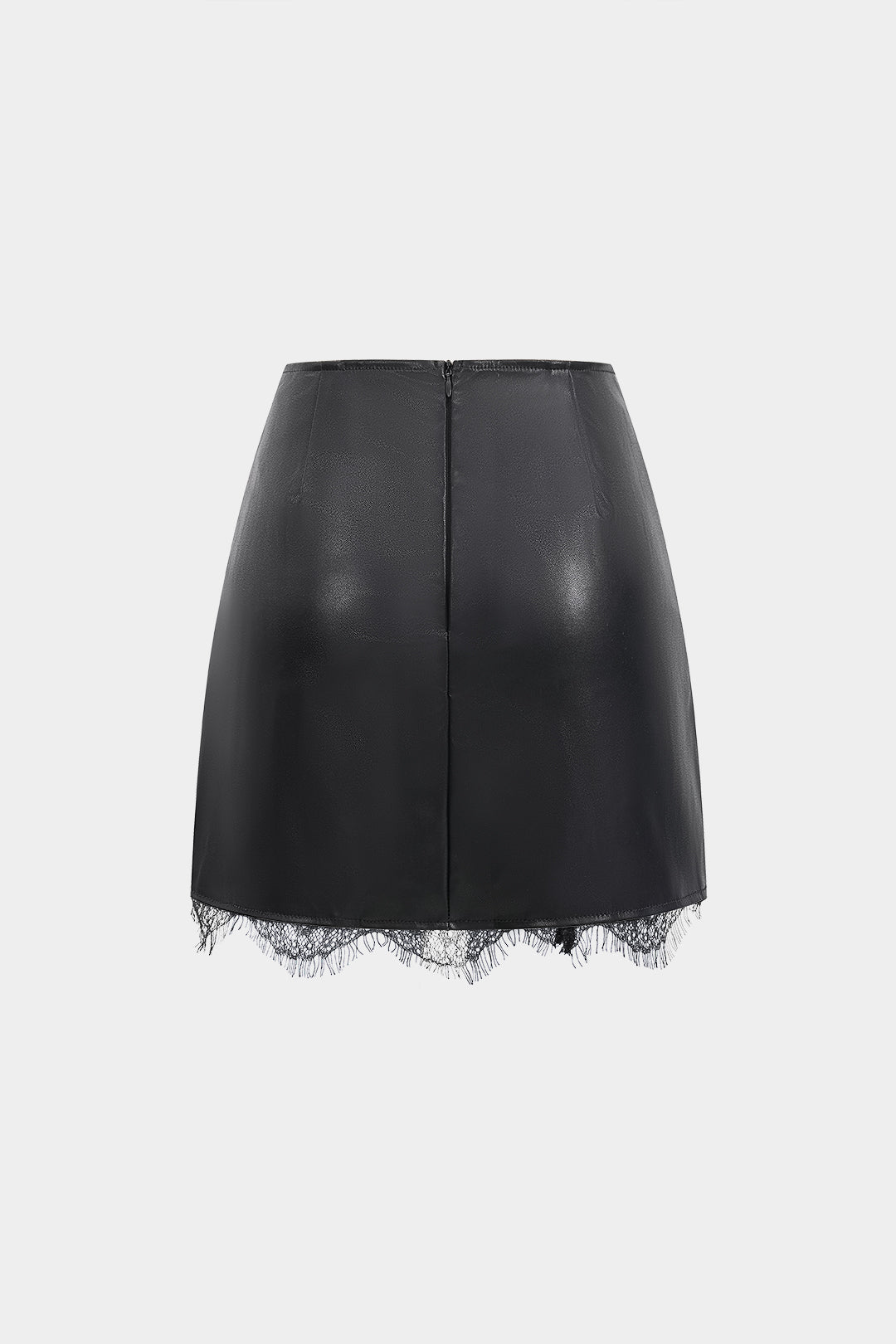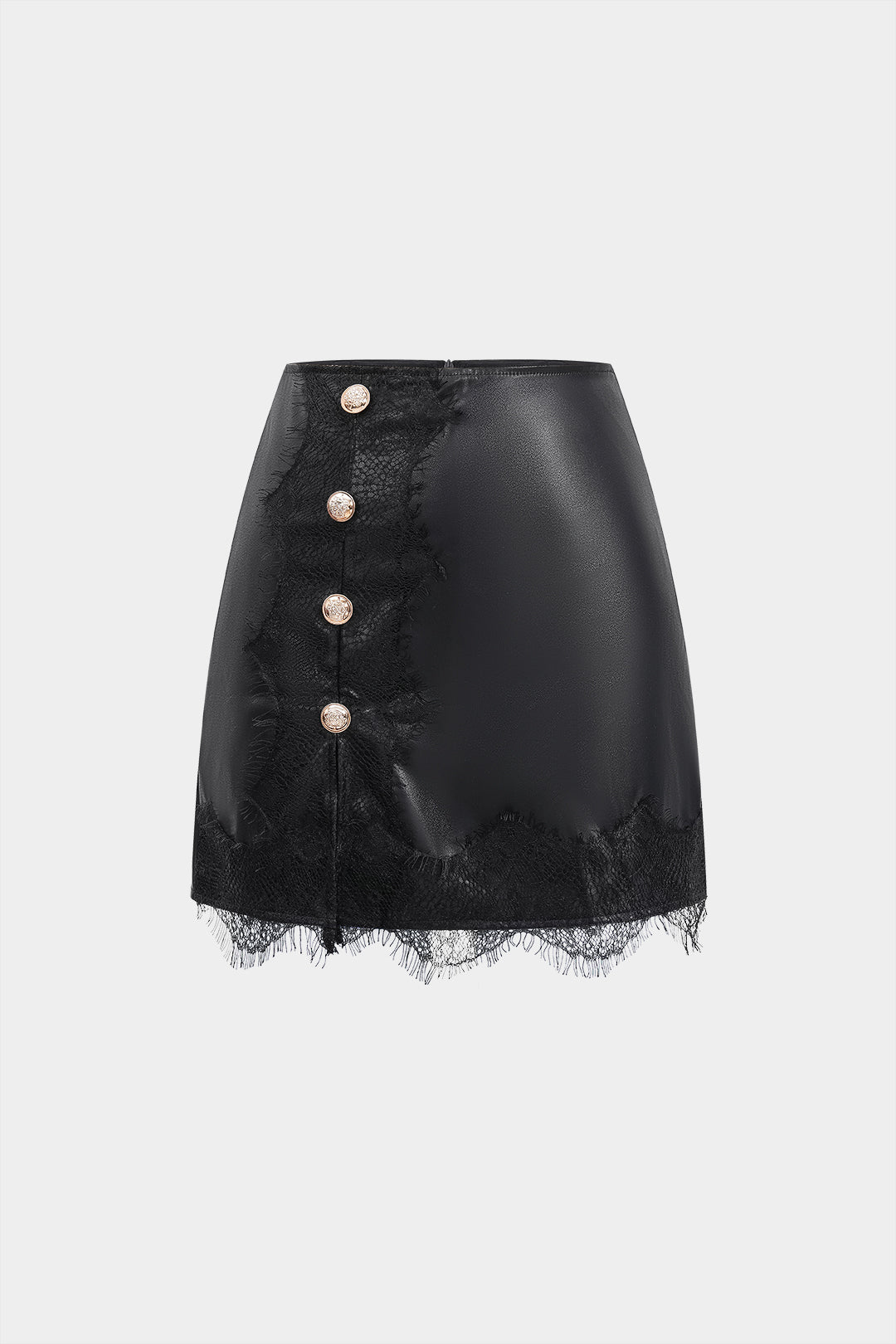 Faux Leather Patchwork Lace Trim Button Mini Skirt