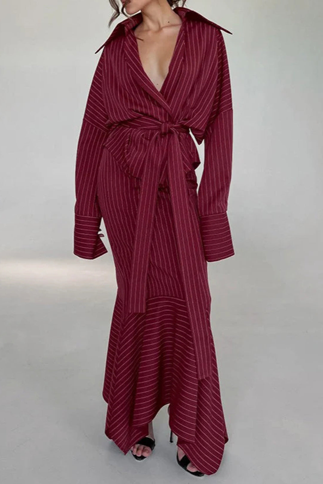 Stripes Print V-Neck Belted Top And Irregular Hem Skirt Set
