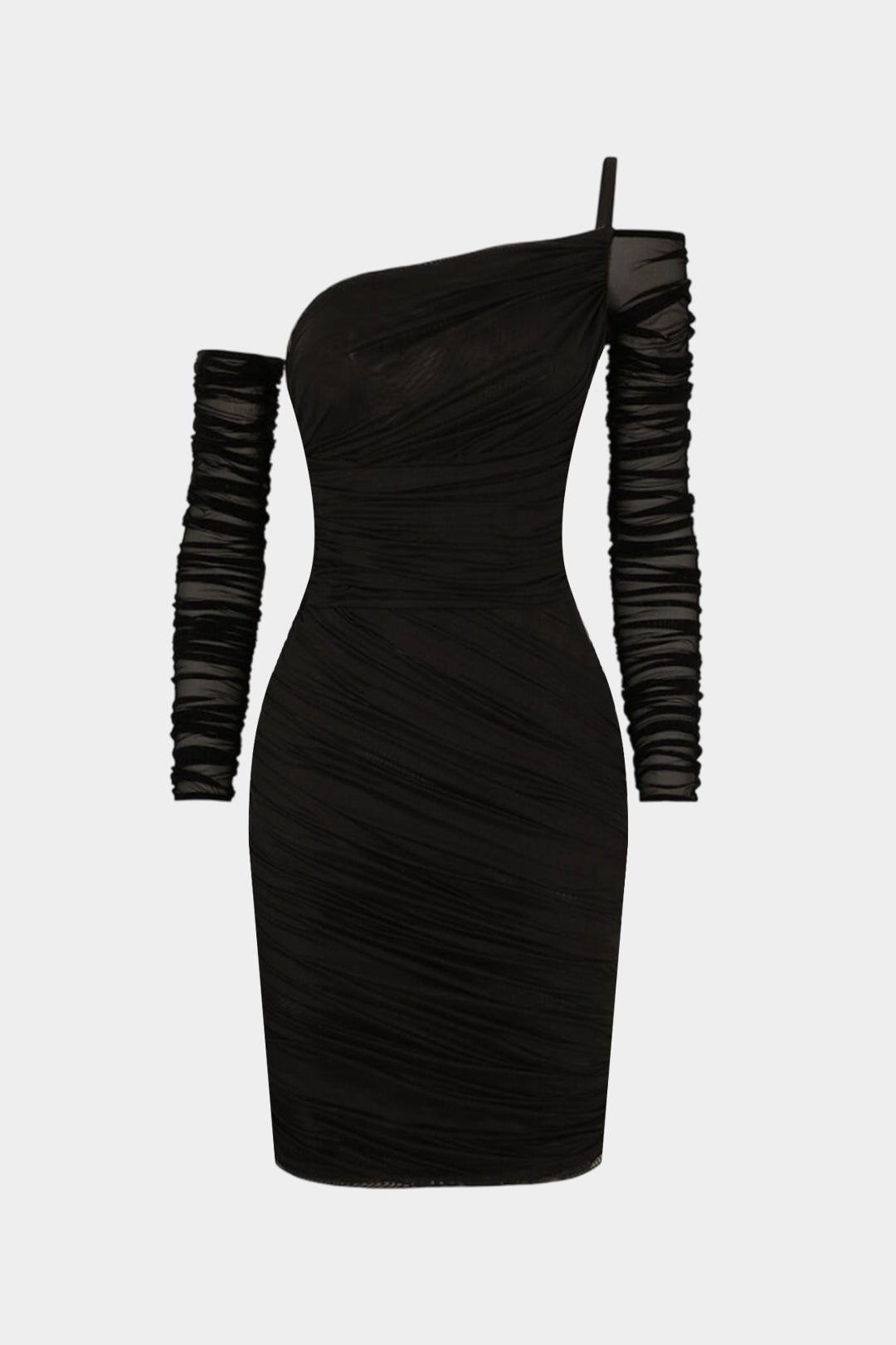 Asymmetrical Mesh Ruched Long Sleeve Mini Dress