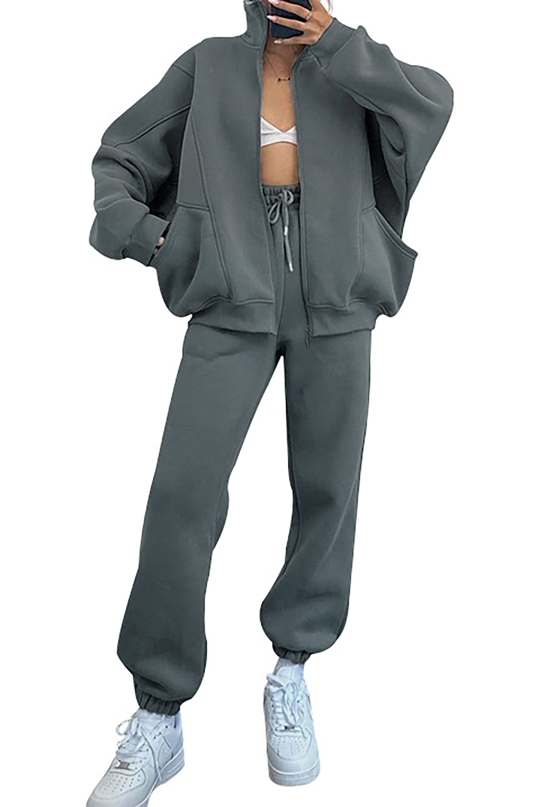 Pocket Zipper Long Sleeve Sweatshirt And High Waist Drawstring Pants Set