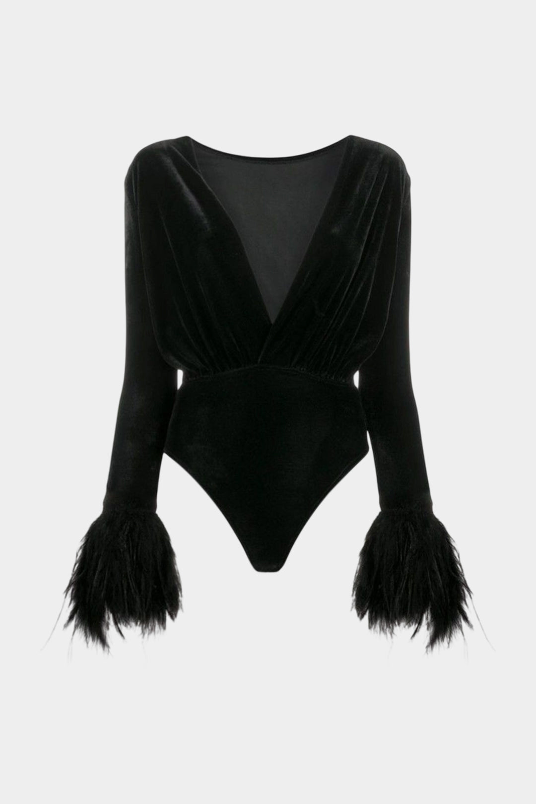 Velvet Patchwork Feather Trim Long Sleeve Bodysuit