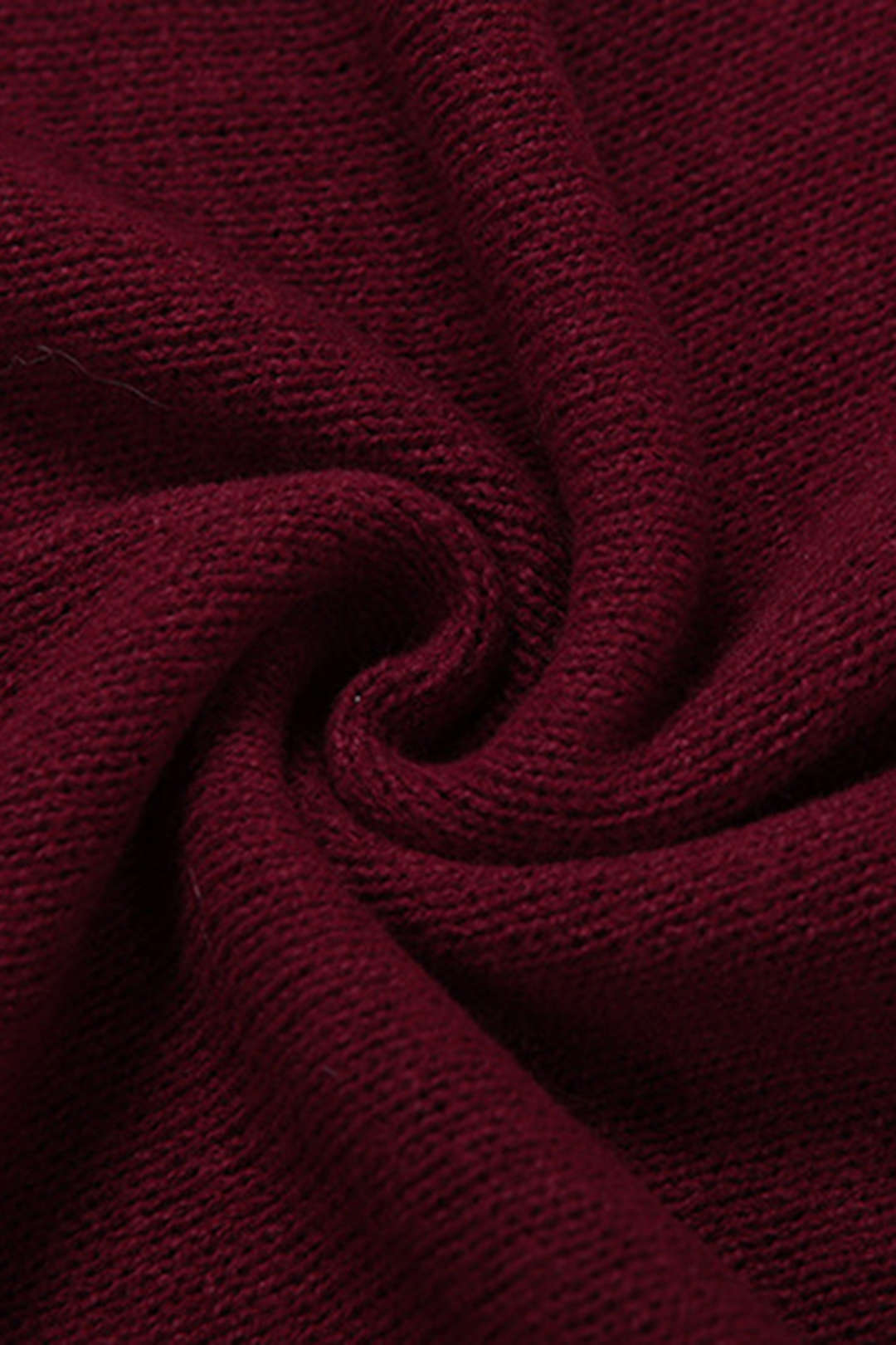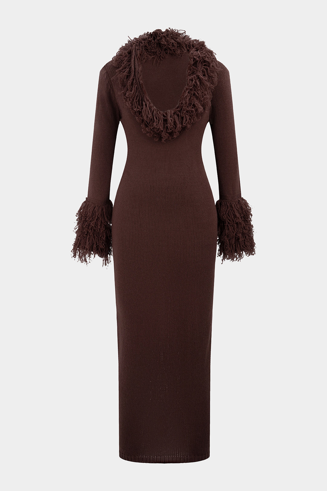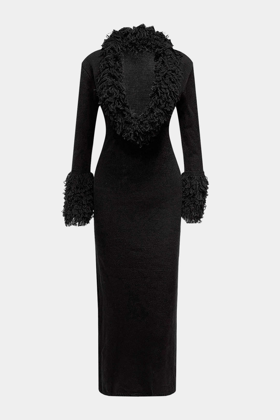 Knit Fringe Trim Deep V-Neck Long Sleeve Dress