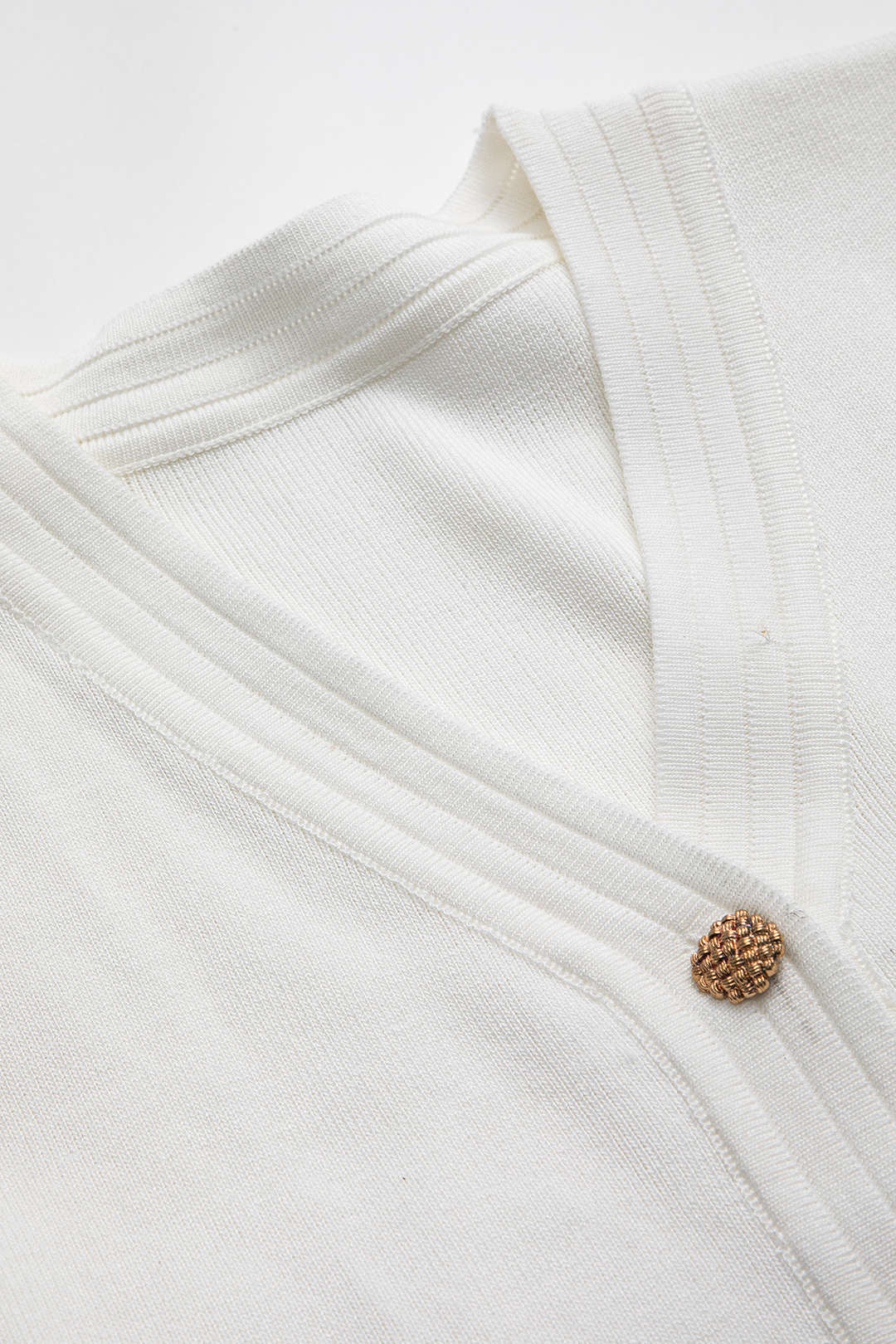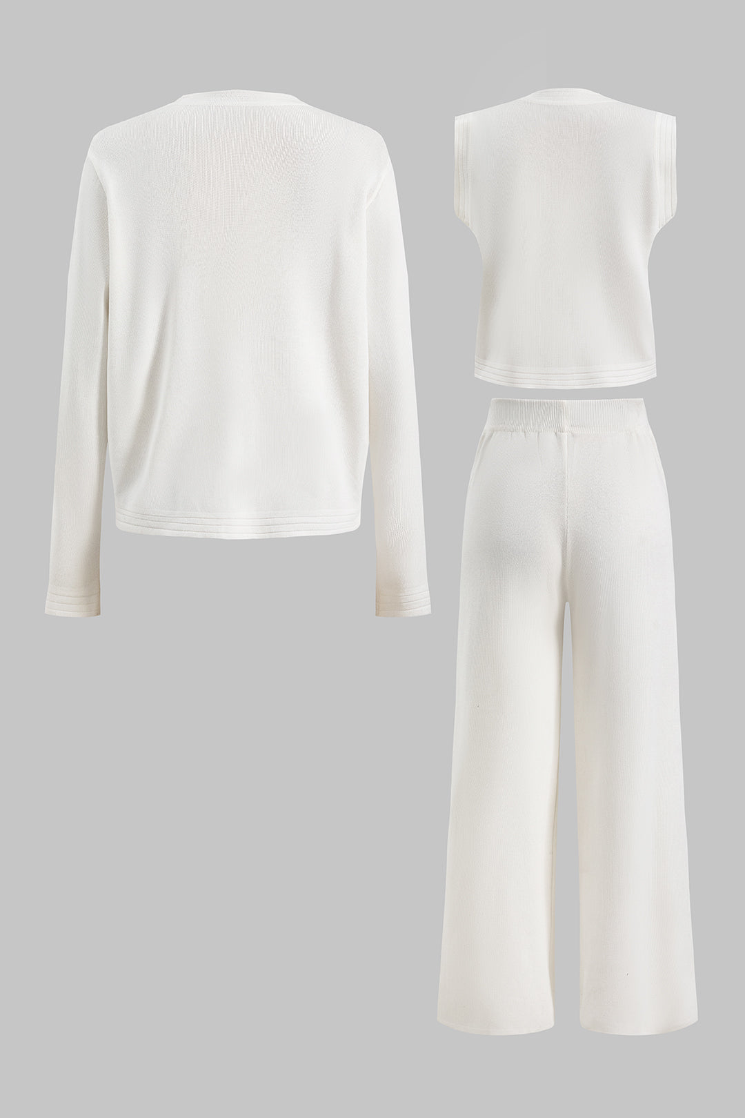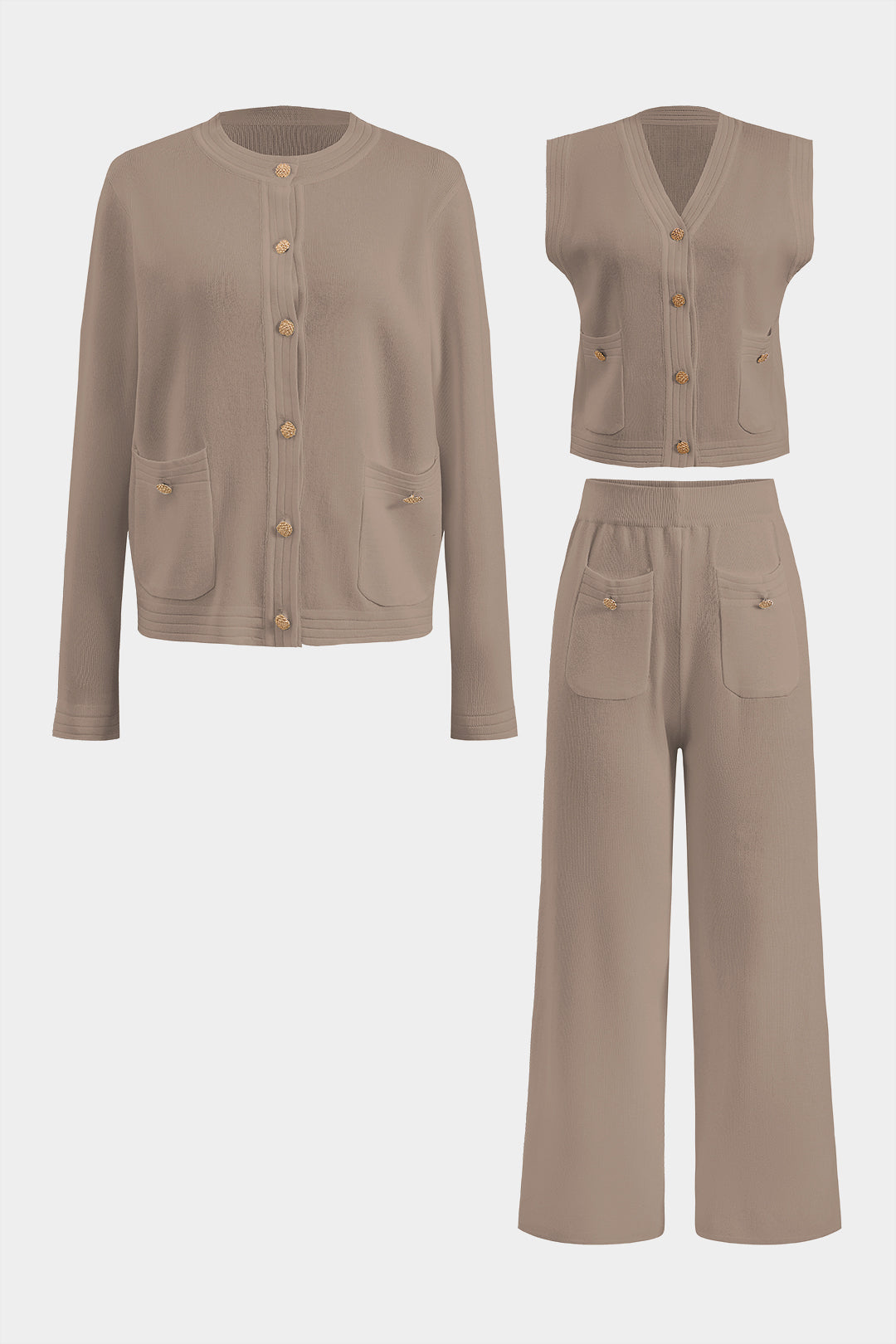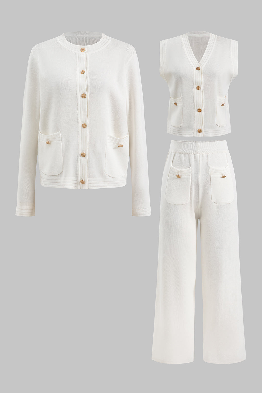 Knit Pocket Metallic Button Cardigan And Solid Vest And Wide Leg Pants Set