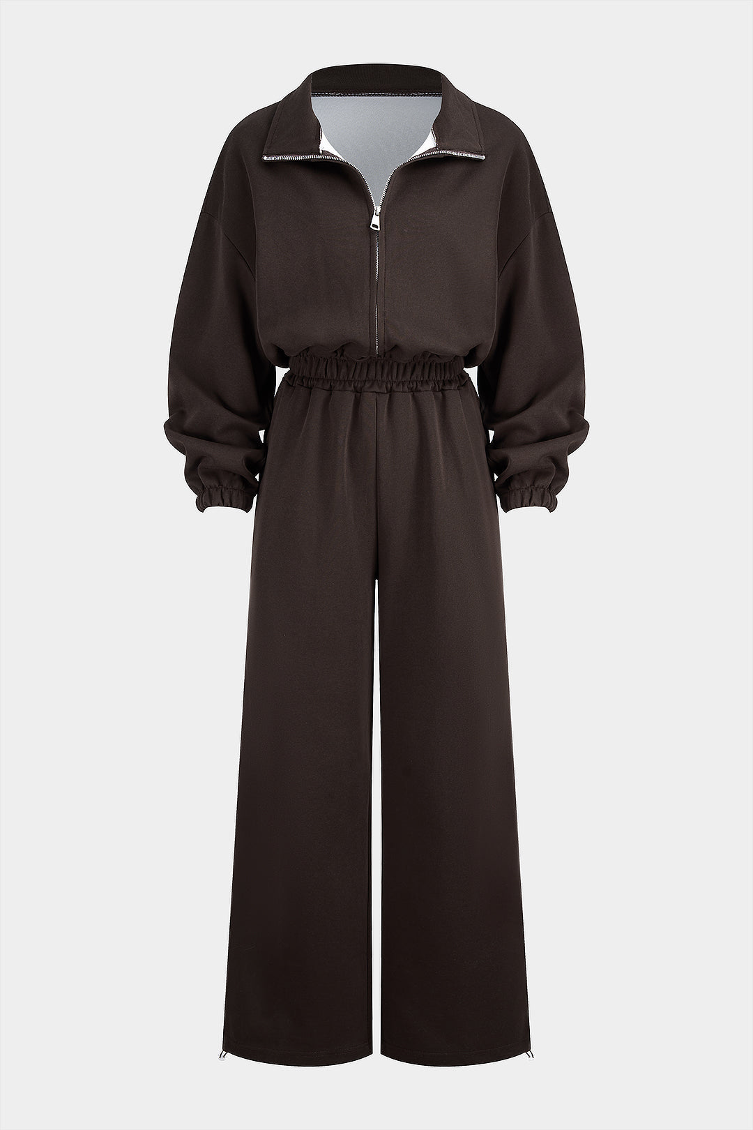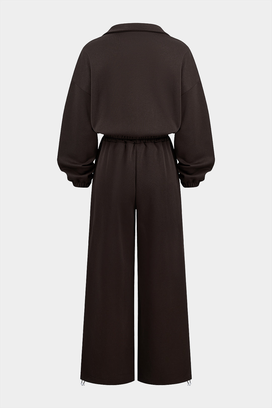 Polo Collar Zipper Shirred Long Sleeve Jumpsuit