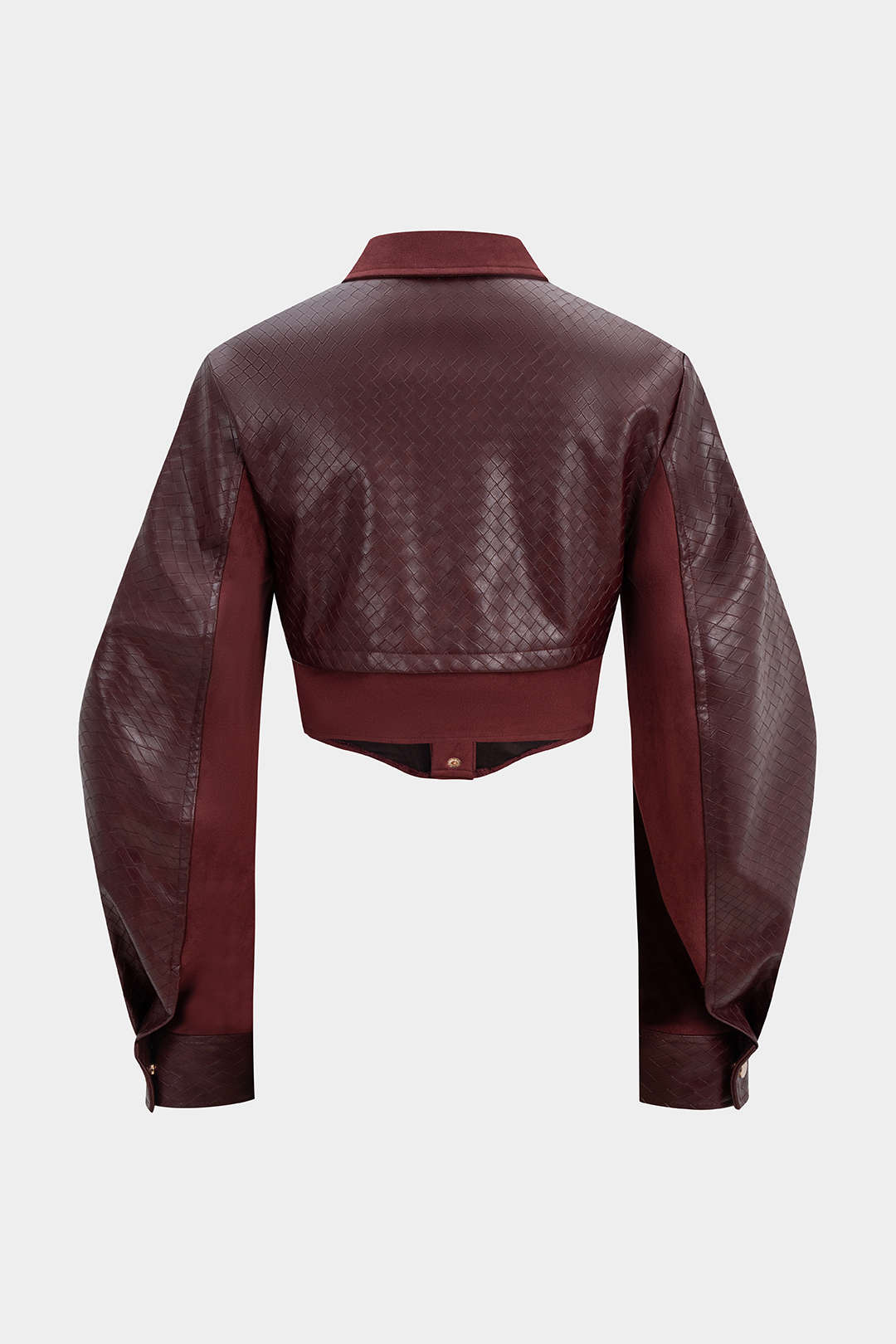 Woven Pattern Faux Leather Patchwork Cropped Jacket