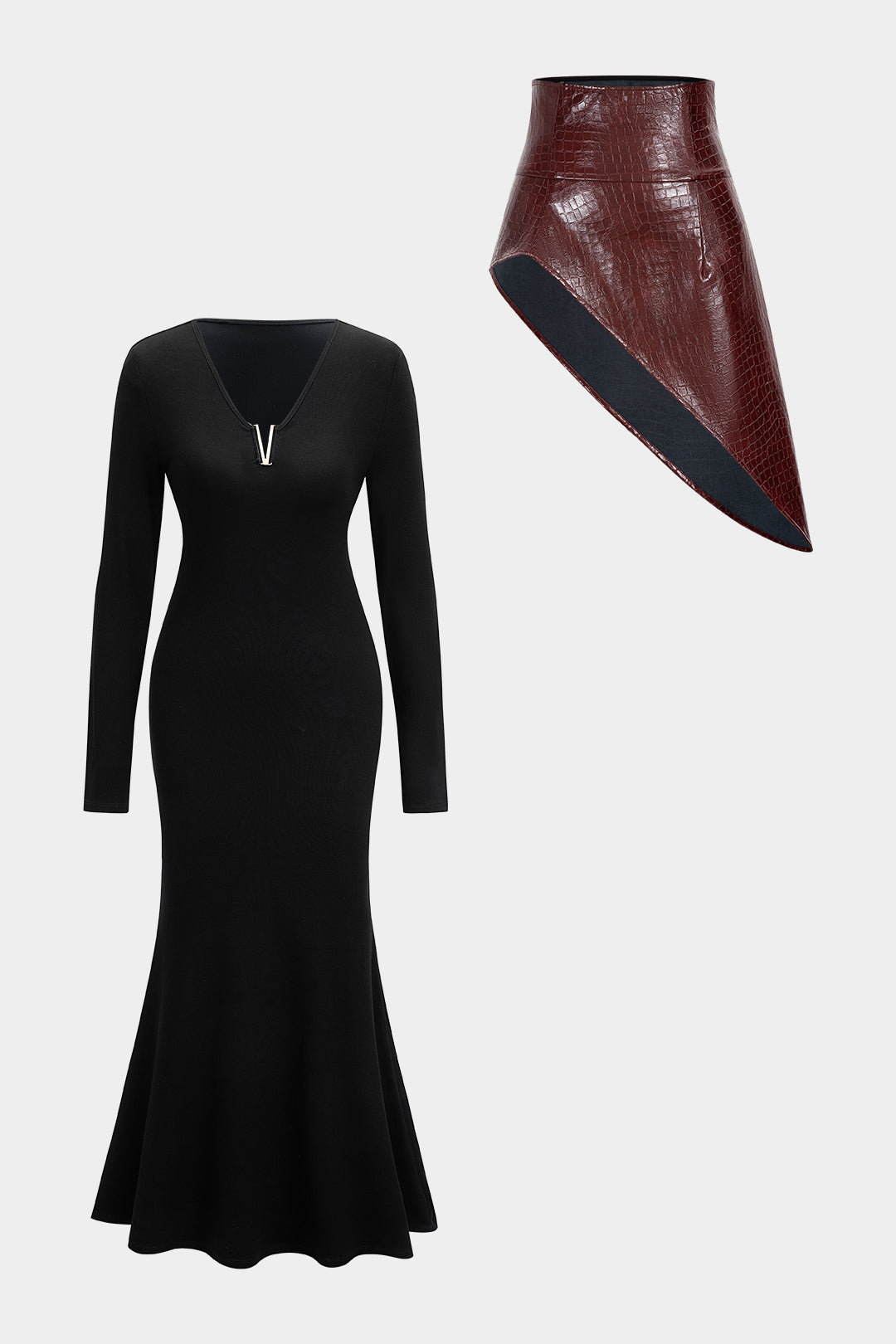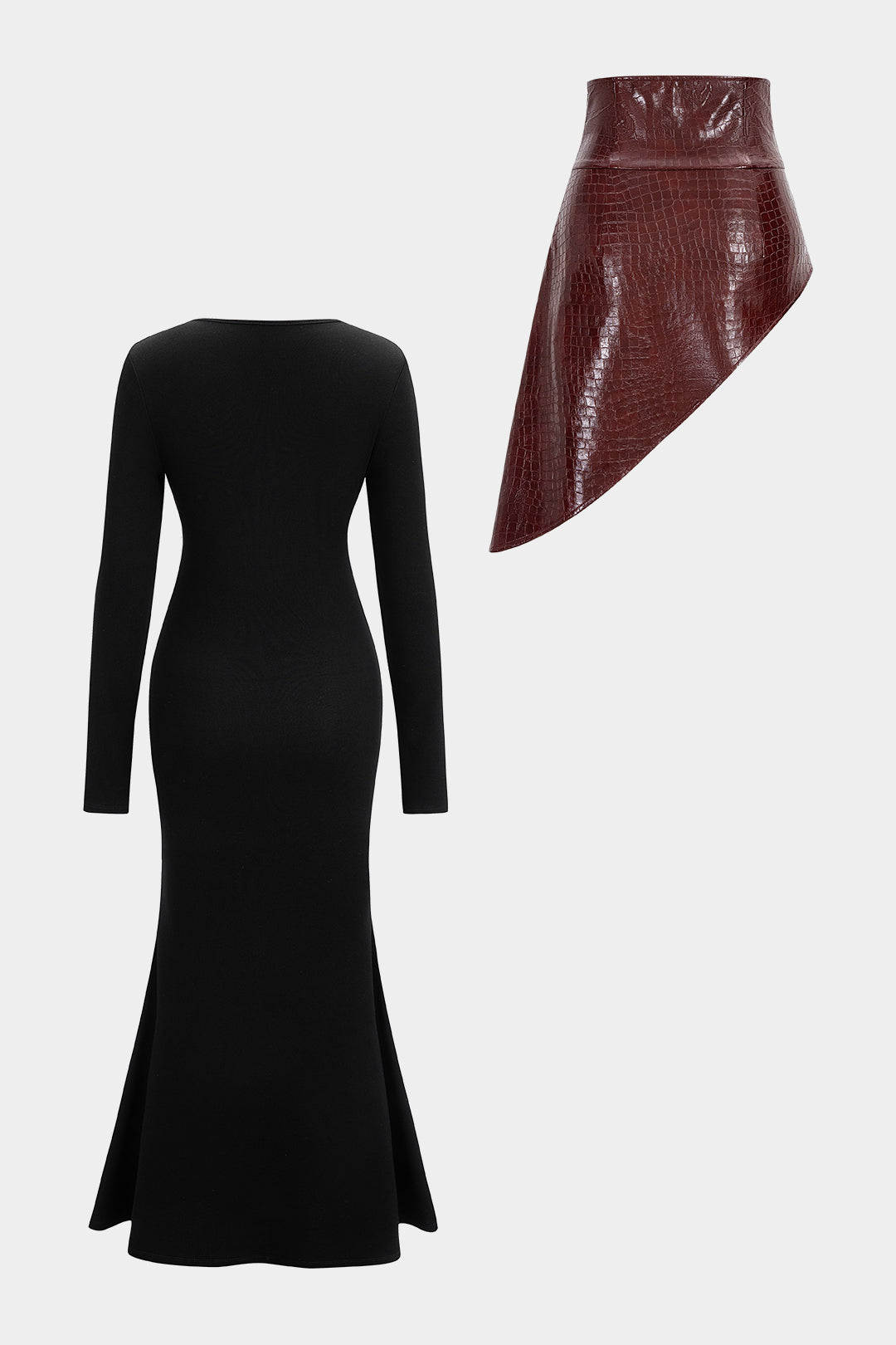 Solid Long-Sleeve Dress And Faux Leather Skirt Set