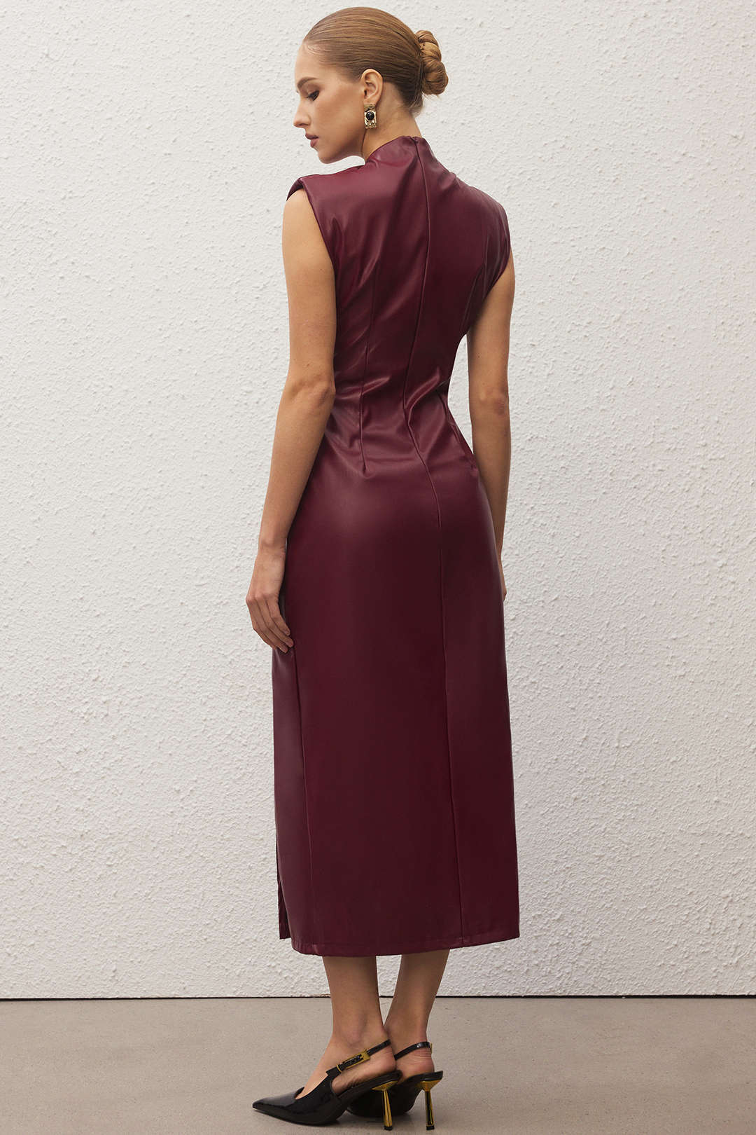 Faux Leather Metallic Decor Ruched Sleeveless Midi Dress