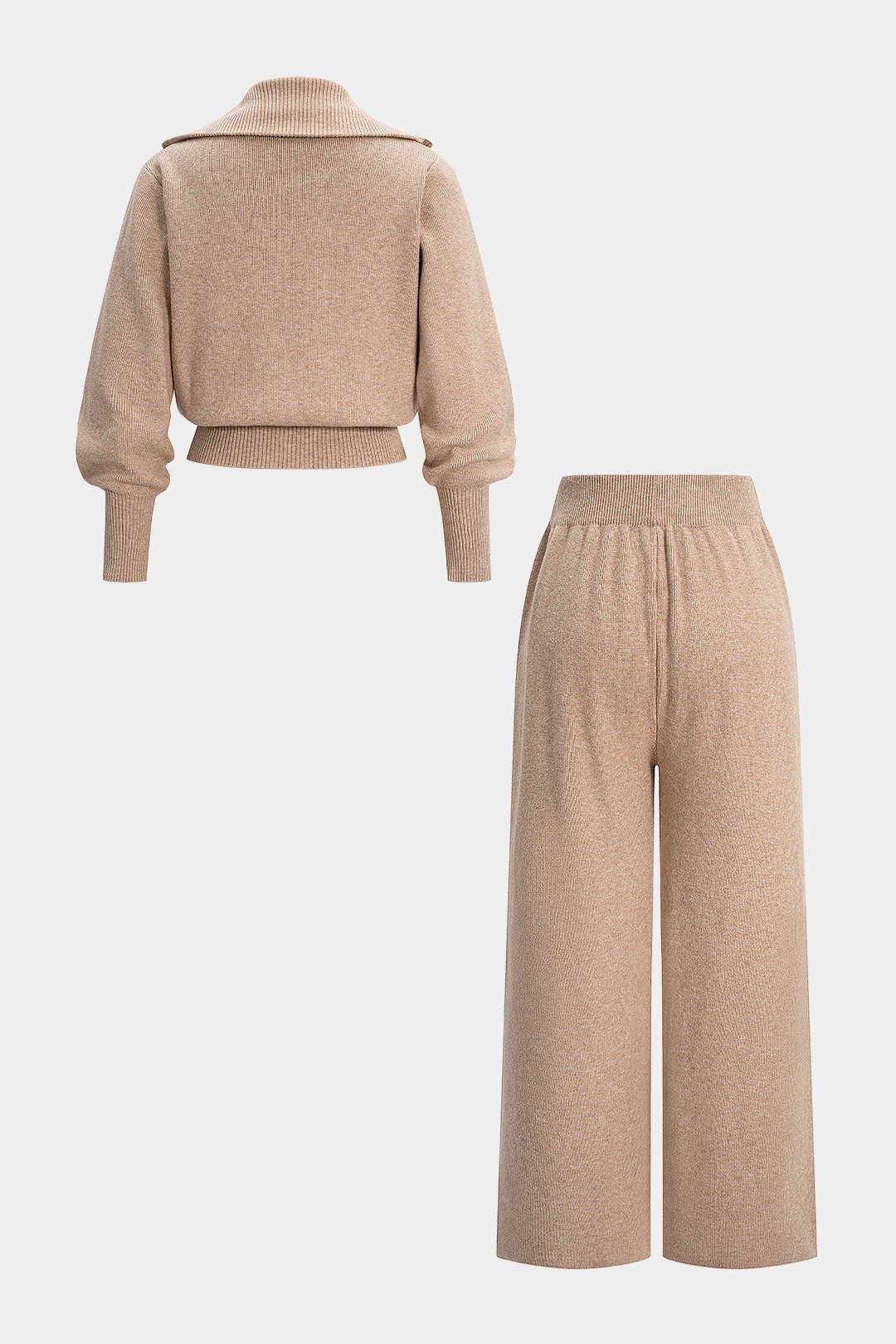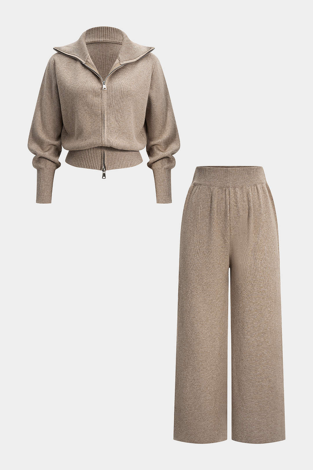 Knit Zipper Long-Sleeve Hoodie And Shirred Waistband Zipper Wide Leg Pants Set