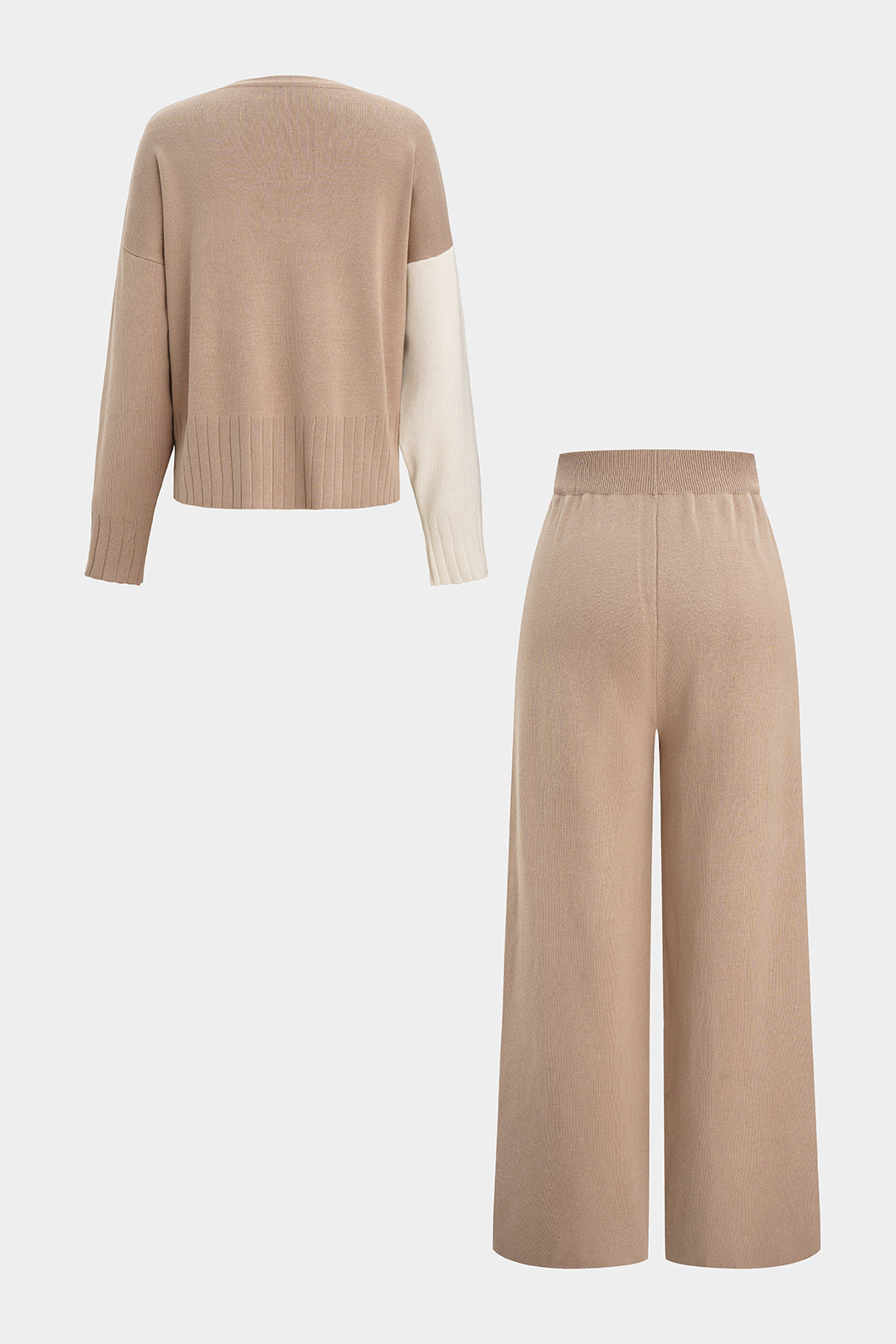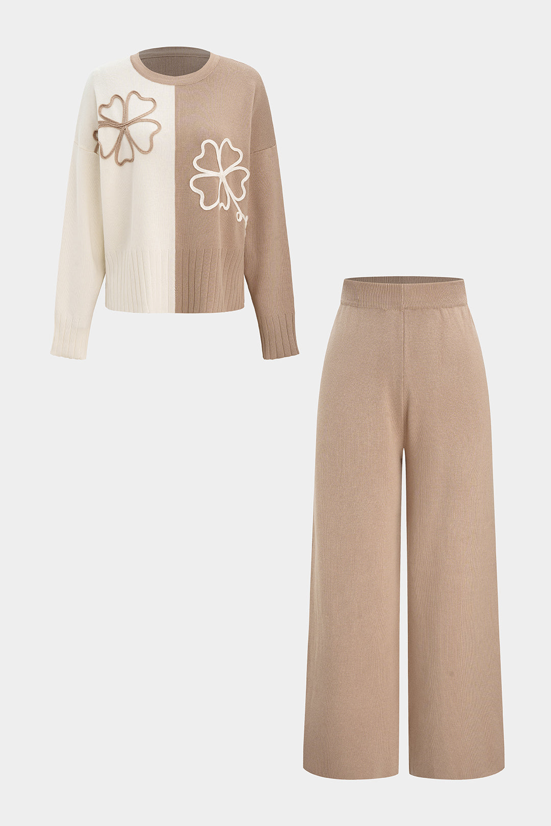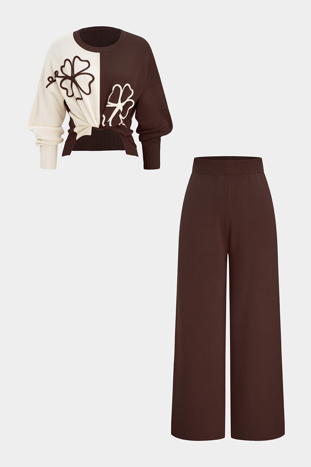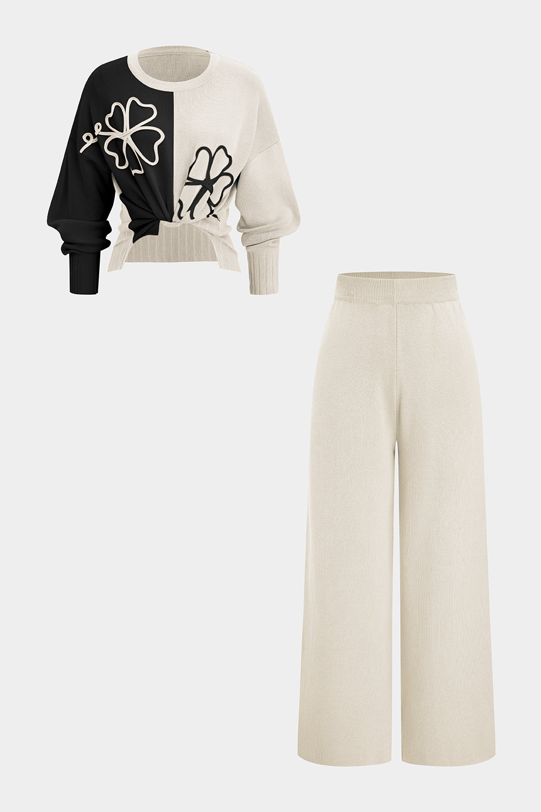 Knit Contrast Flower Applique Long-Sleeve Top And Wide Leg Pants Set