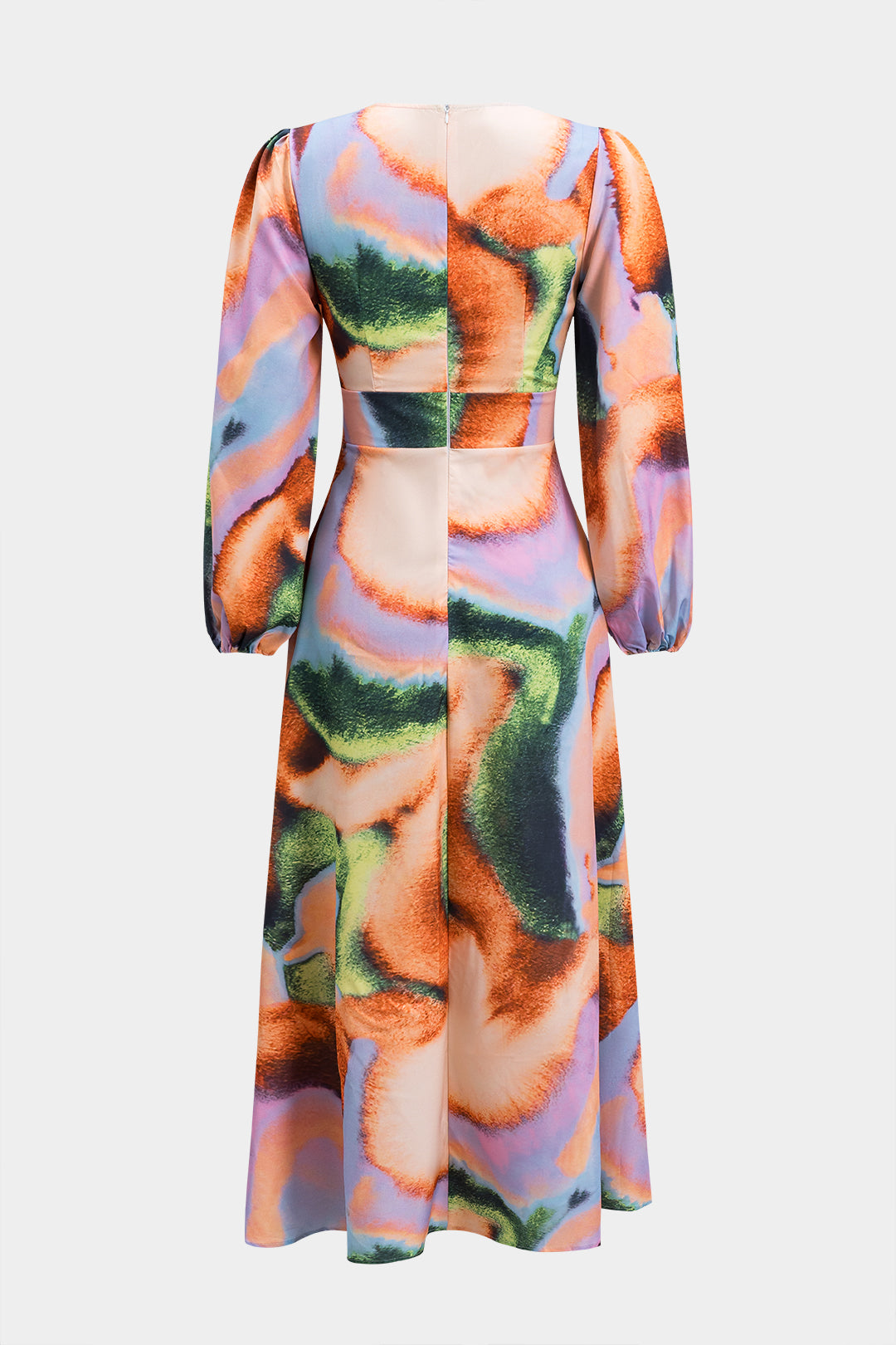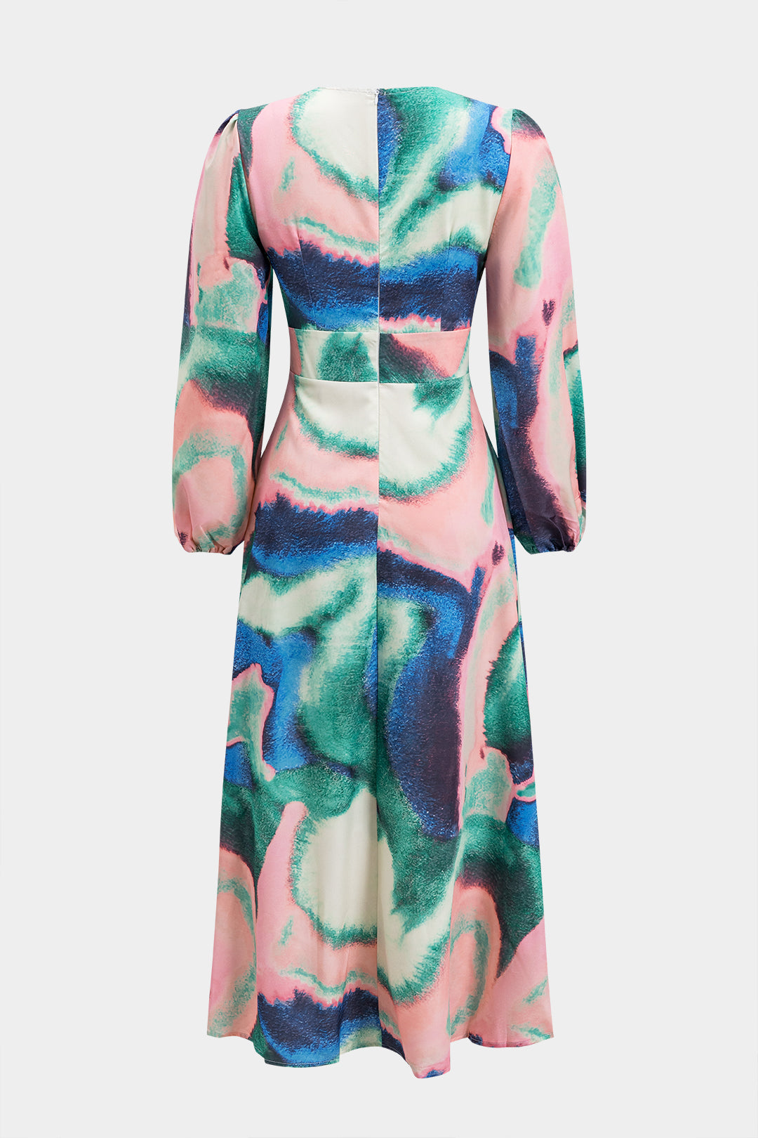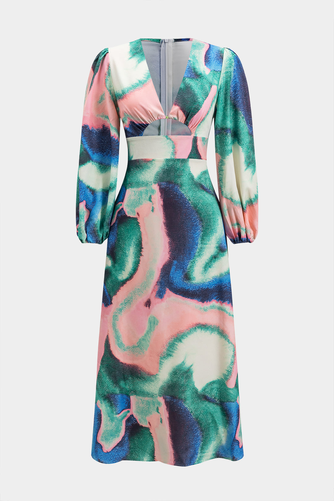 Watercolor Print Cut Out V-Neck Long Sleeve Midi Dress