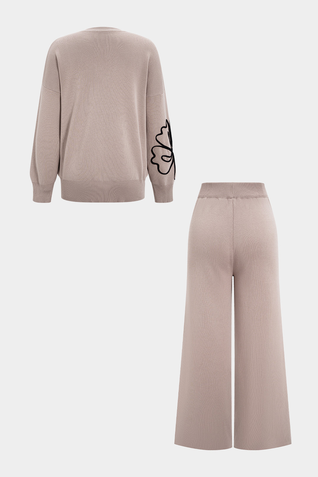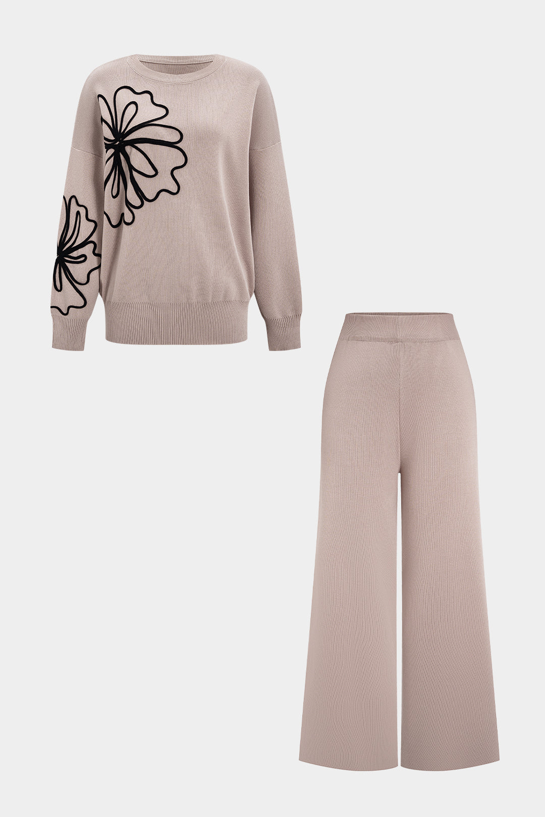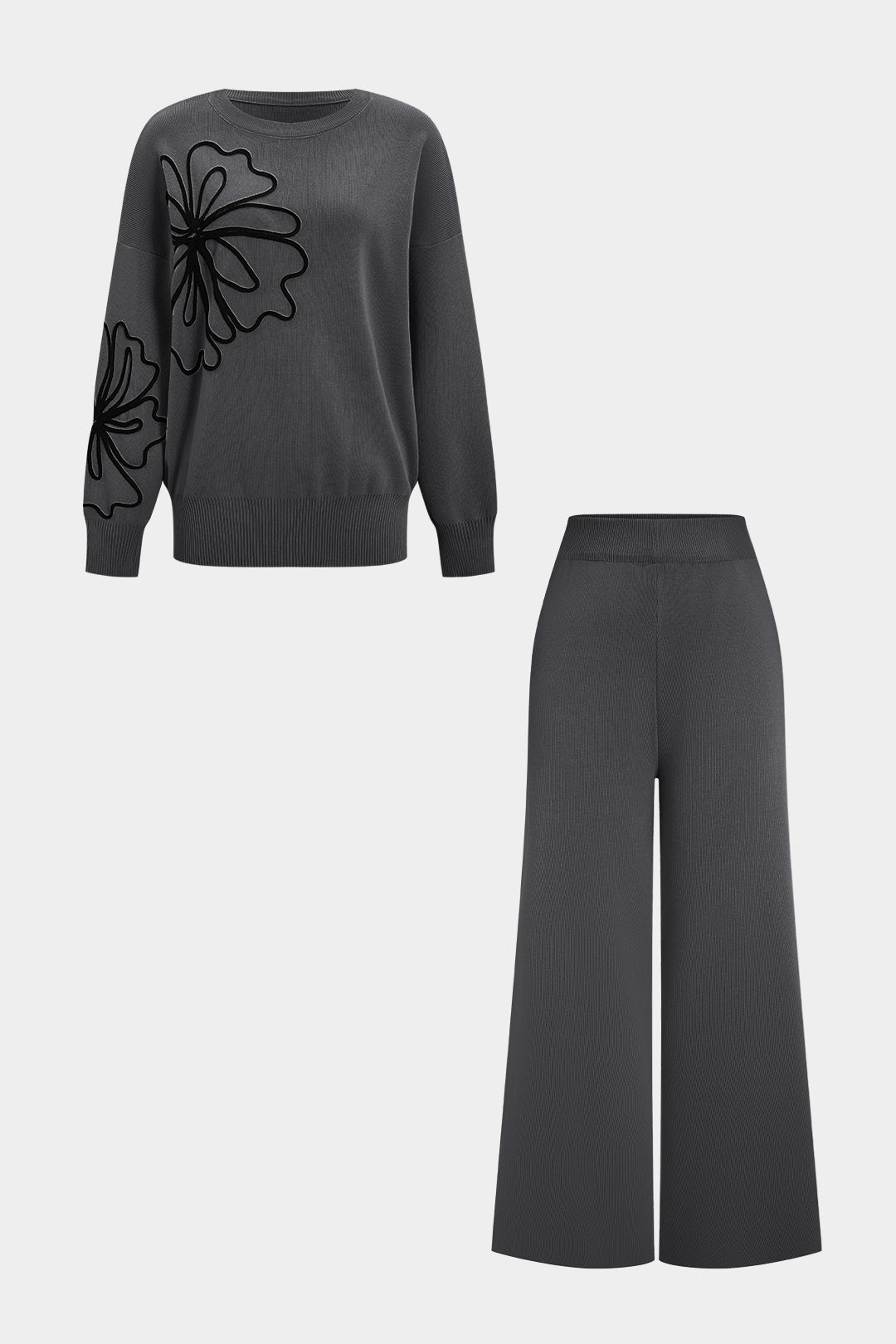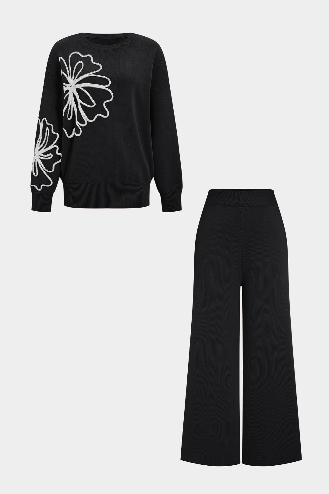 Knit 3D Flower Embroidery Long-Sleeve Top And Solid Pants Set
