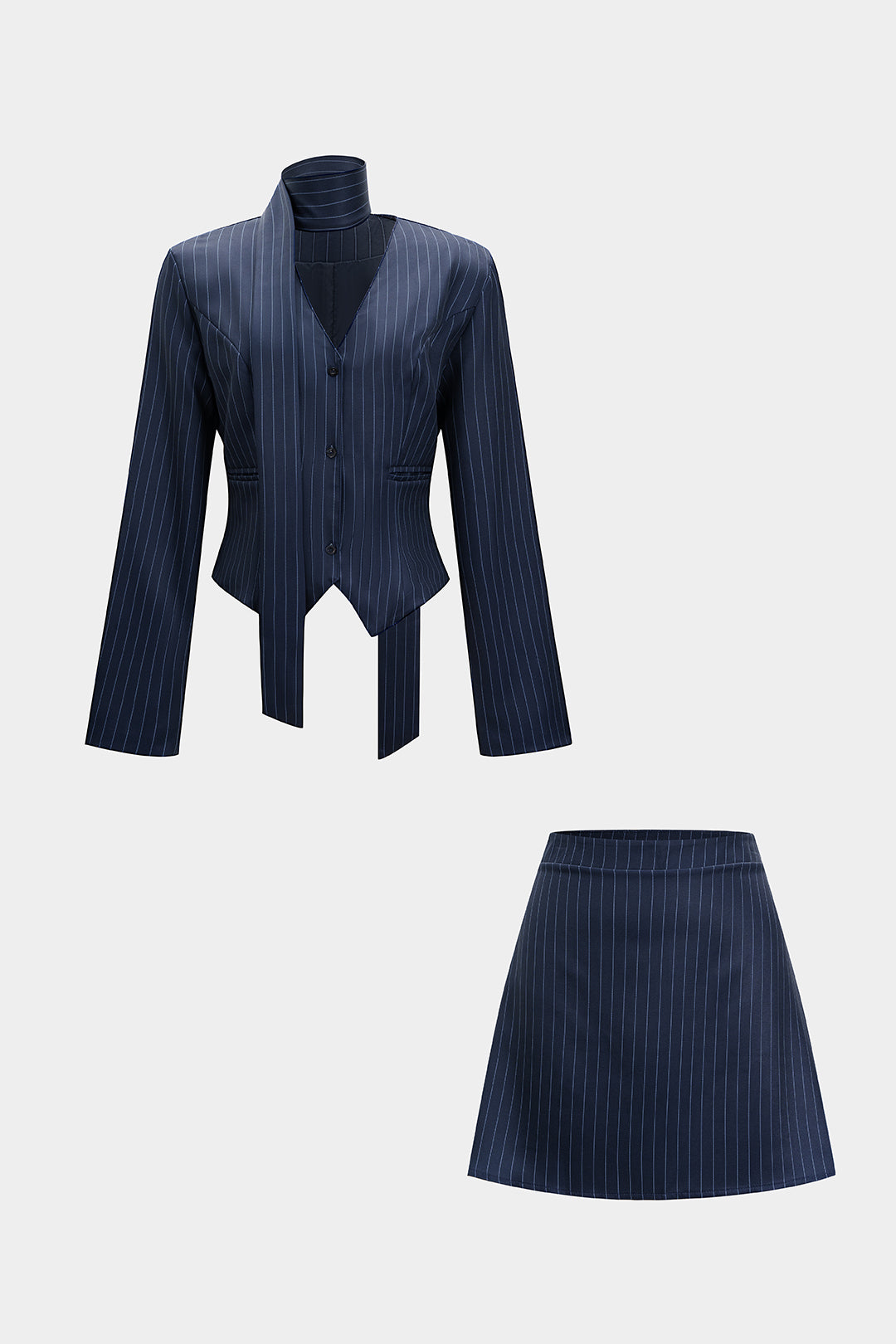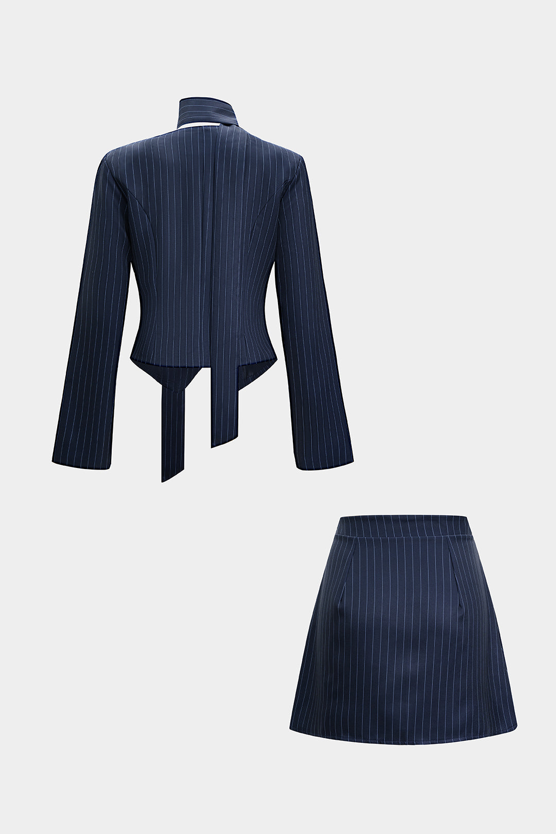 Striped Print V-Neck Long-sleeve Top With Scarf And Mini Skirt Set