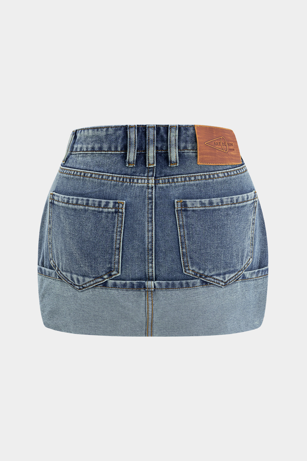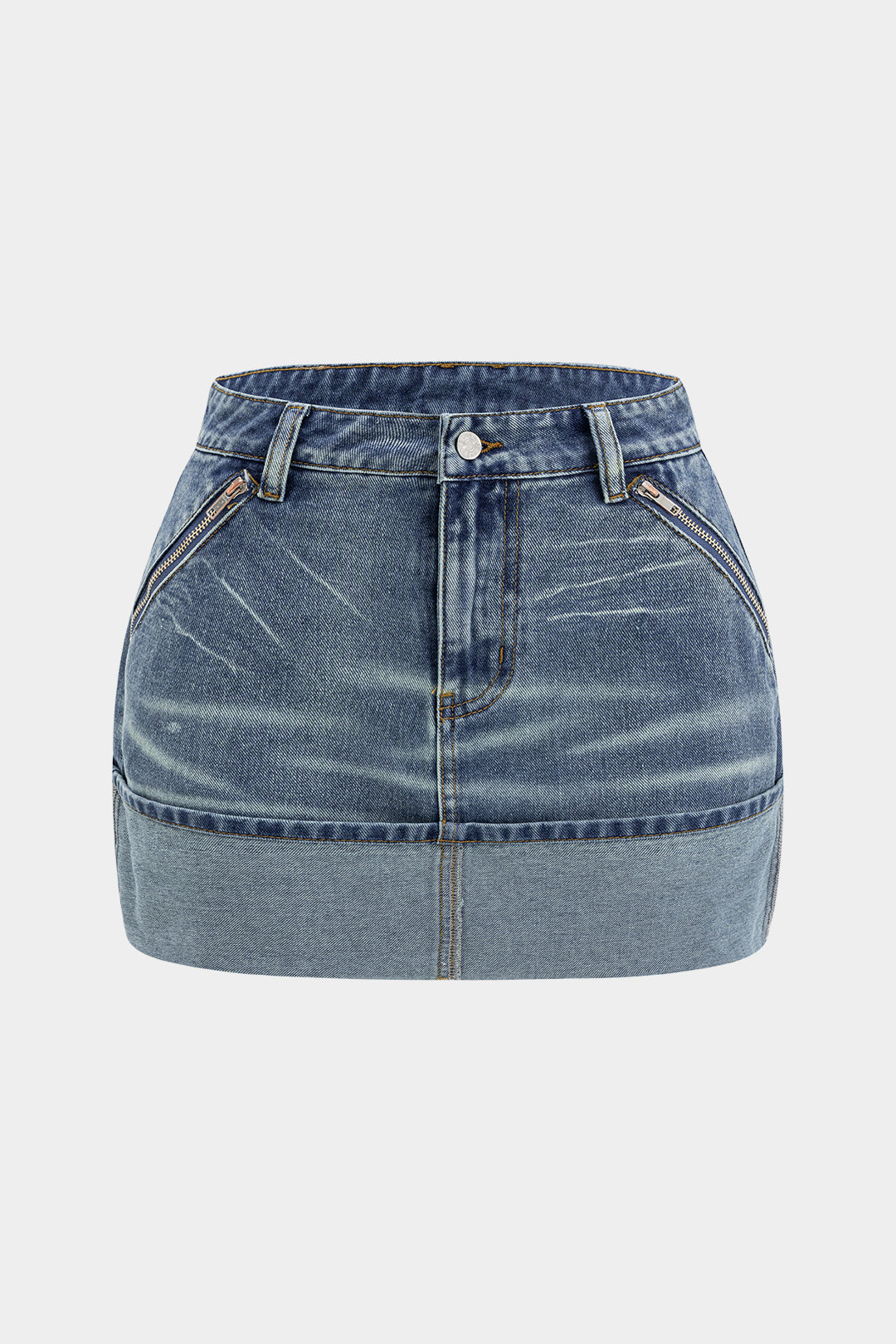 Plus Size Denim Washed Cuffed Pocket Skirt