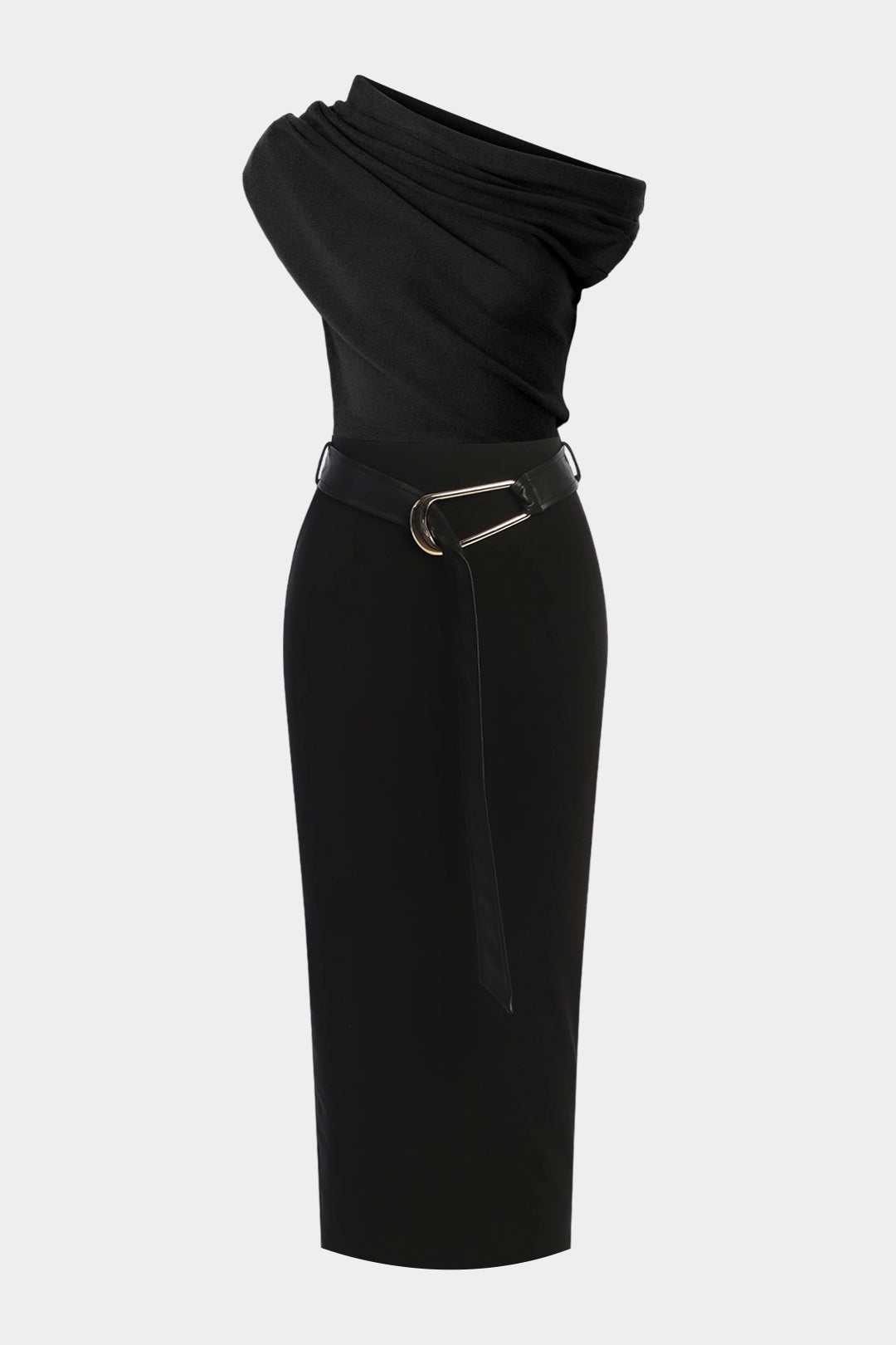 Draped Cowl Neck One Shoulder Belted Short Sleeve Midi Dress