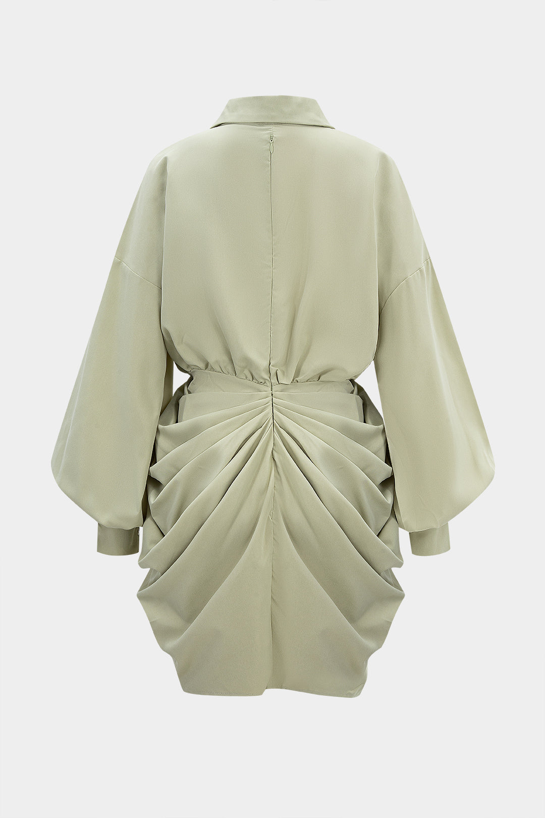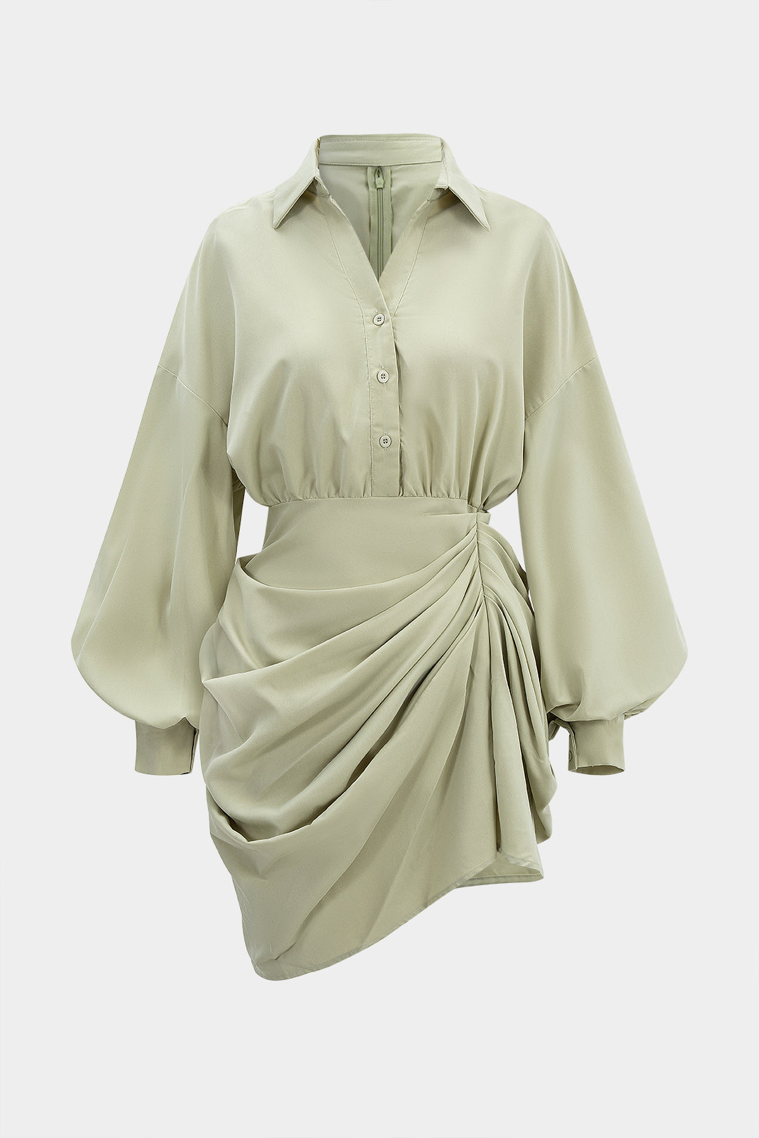 Satin Button Asymmetrical Ruched High Waist Long Sleeve Mini Dress
