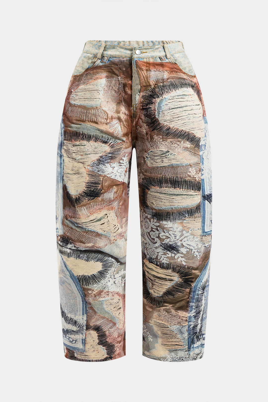 Plus storlek abstrakt tryckt dragkedja breda benbyxor